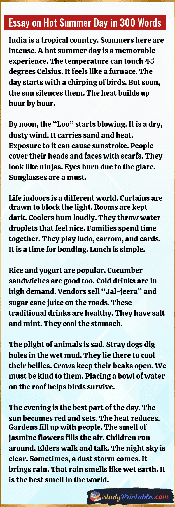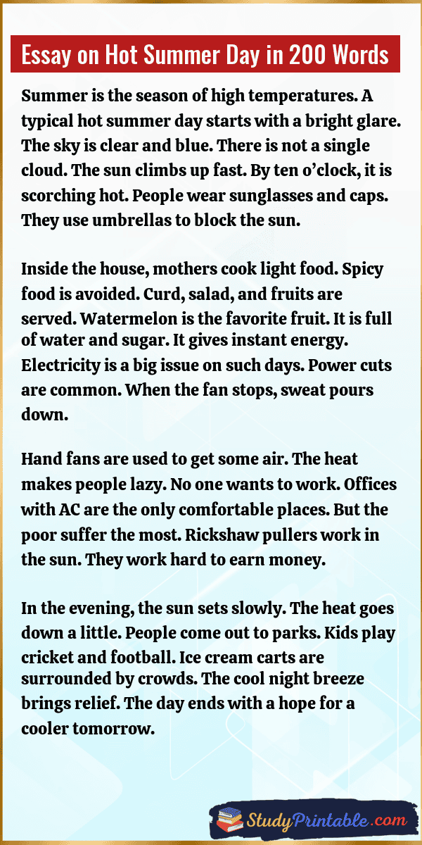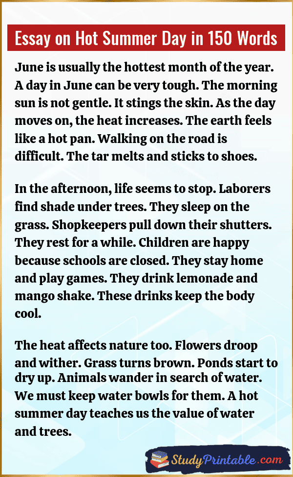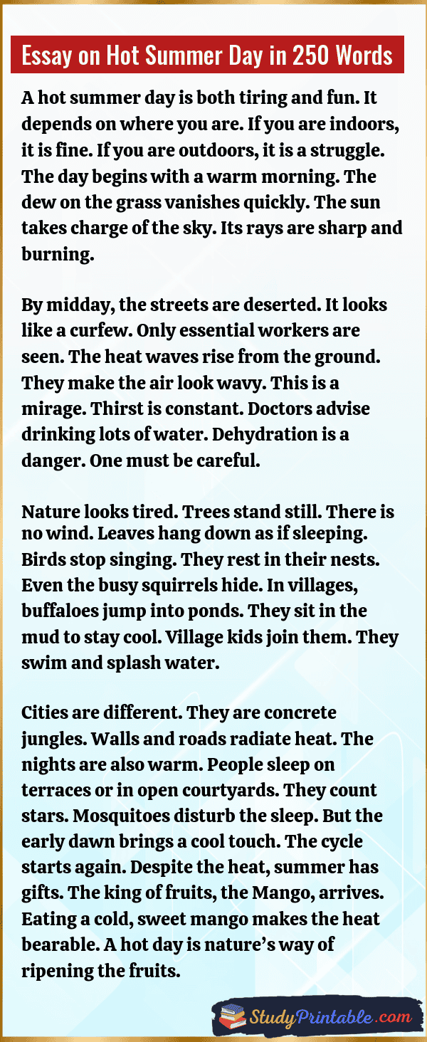 A hot summer day can be very hard. The sun shines with all its might. The heat is strong and drains energy. People and animals look for shade. Water becomes the most precious thing. Yet, this day has its own joys. It brings sweet mangoes and ice creams. It brings long holidays for students. These essays are written for students in classes 1 to 12.
