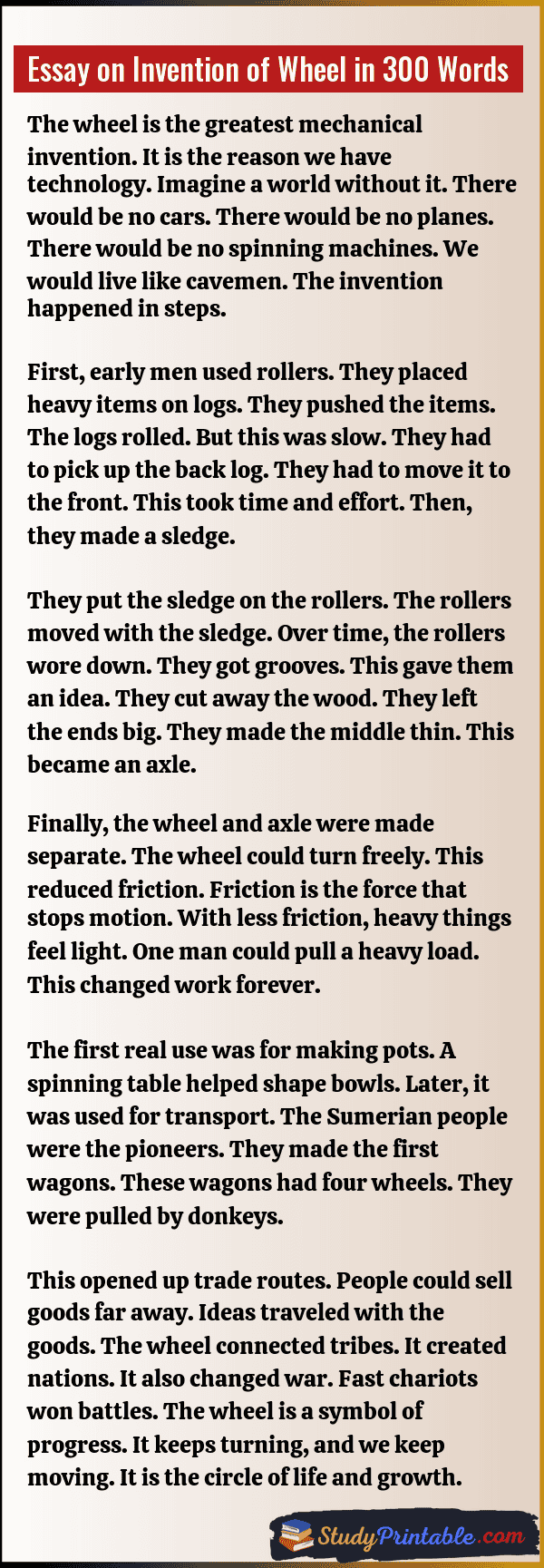 The wheel is a simple circle. But it changed the whole world. Before it, life was very hard. People carried heavy loads. Travel was slow and tiring. The wheel made things move fast. It helped build cities. It helped trade goods. Today, wheels are everywhere. They are in cars, clocks, and toys. It is the best invention ever. These essays are written for students in classes 1 to 12.