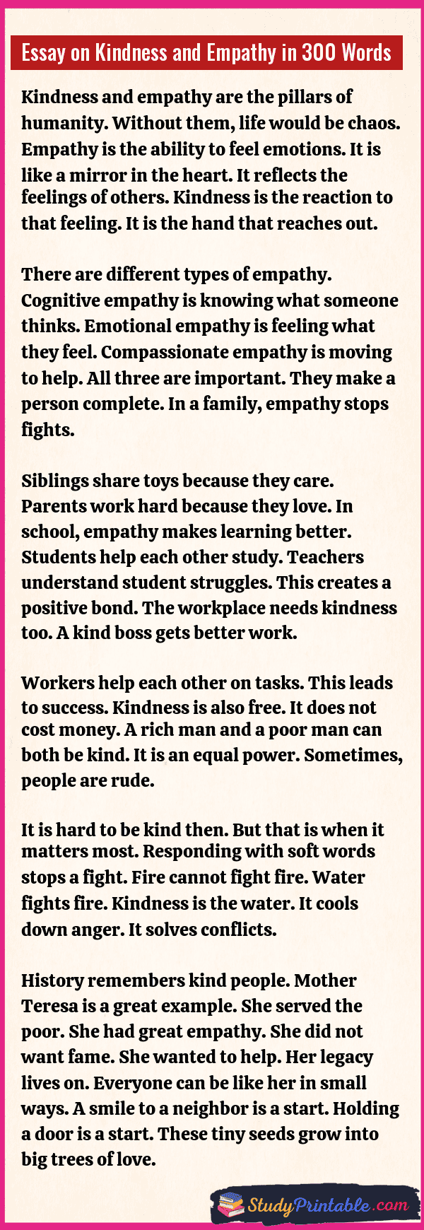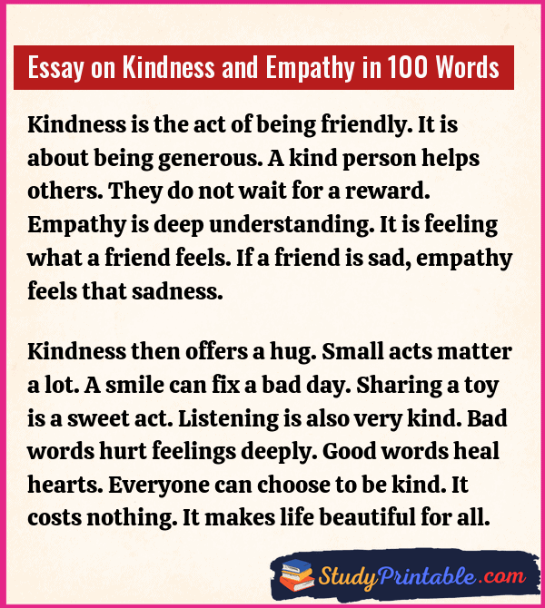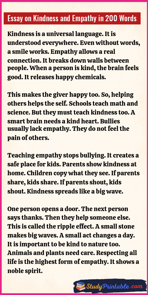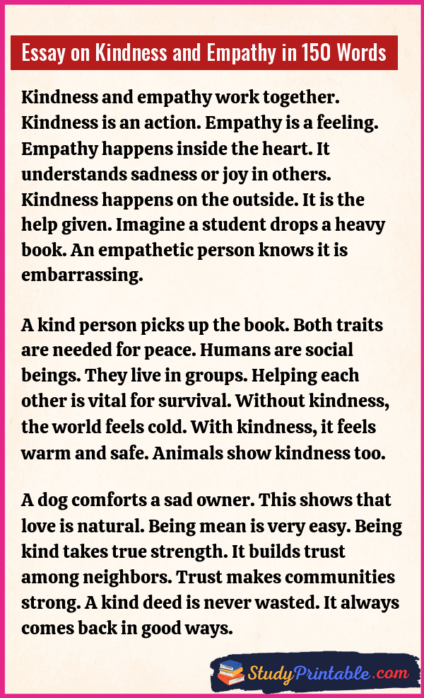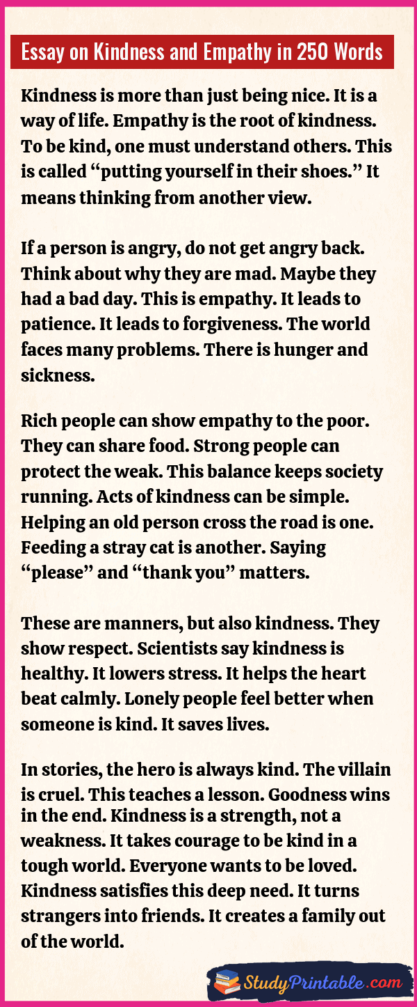 Kindness is a special power. It makes the world a bright place. Empathy is understanding how others feel. Together, they build strong friendships. A kind heart helps people connect. It solves problems without fighting. Everyone needs love and care. These traits make society better. They bring joy to life. These essays are written for students in classes 1 to 12.