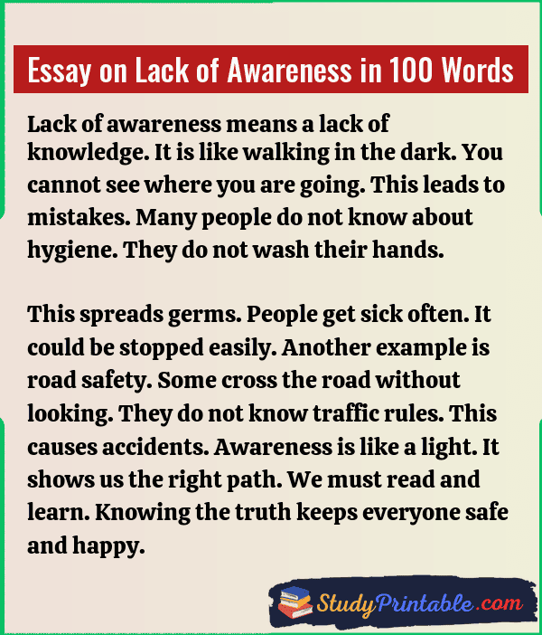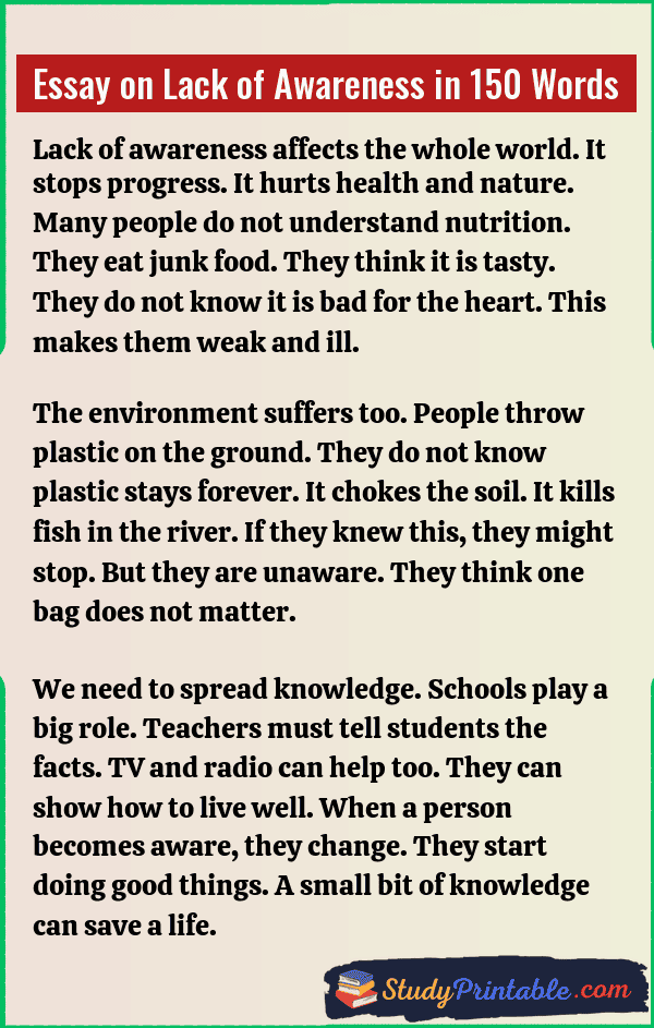 Lack of awareness is a big problem. It means not knowing important facts. This causes many issues in daily life. People get sick or hurt because they do not know better. It harms the earth too. Learning is the only cure. When we know more, we live better. Knowledge keeps us safe. These essays are written for students in classes 1 to 12.