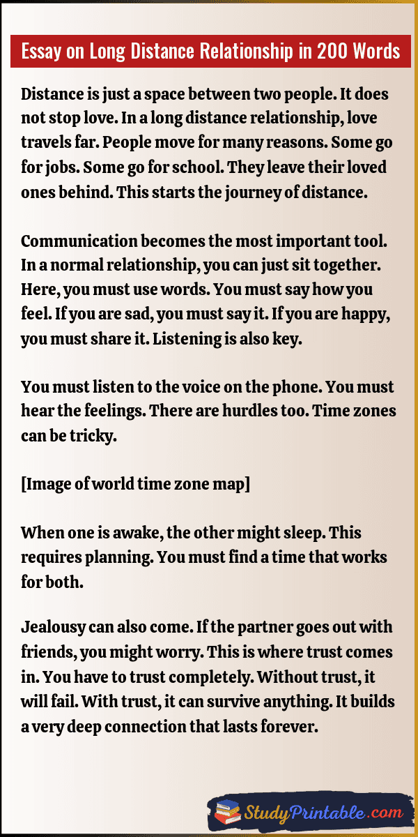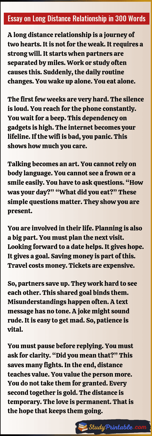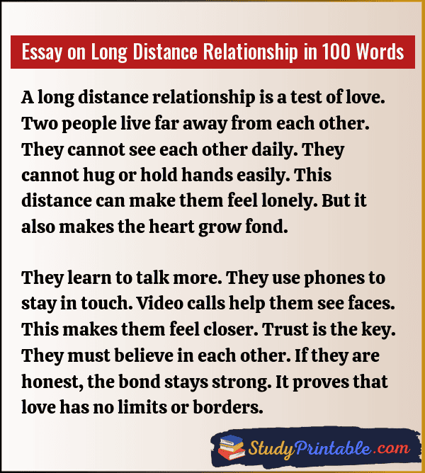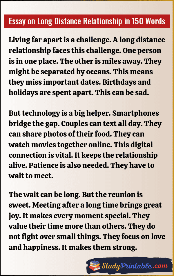 A long distance relationship is a special bond. It happens when two people care for each other but live far apart. They might be in different cities. They might be in different countries. It is hard but also beautiful. It teaches trust and patience. It shows that love is stronger than miles. These essays are written for students in classes 1 to 12.