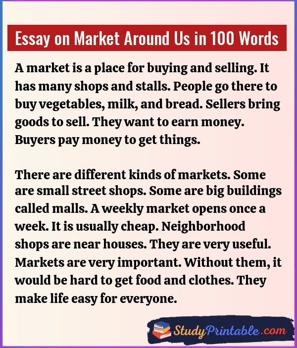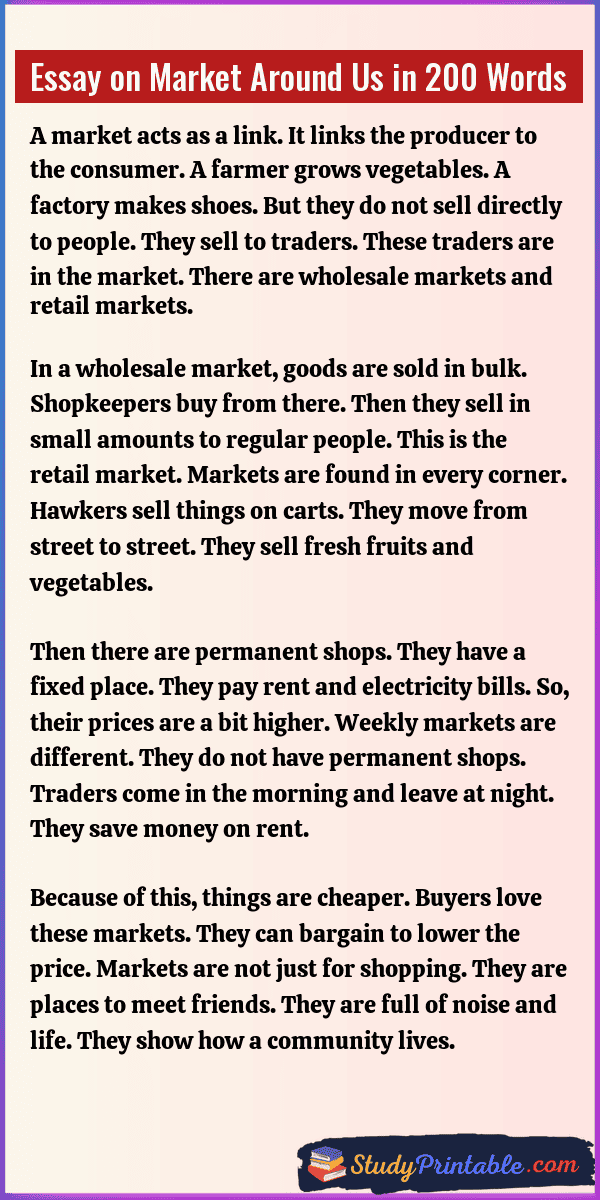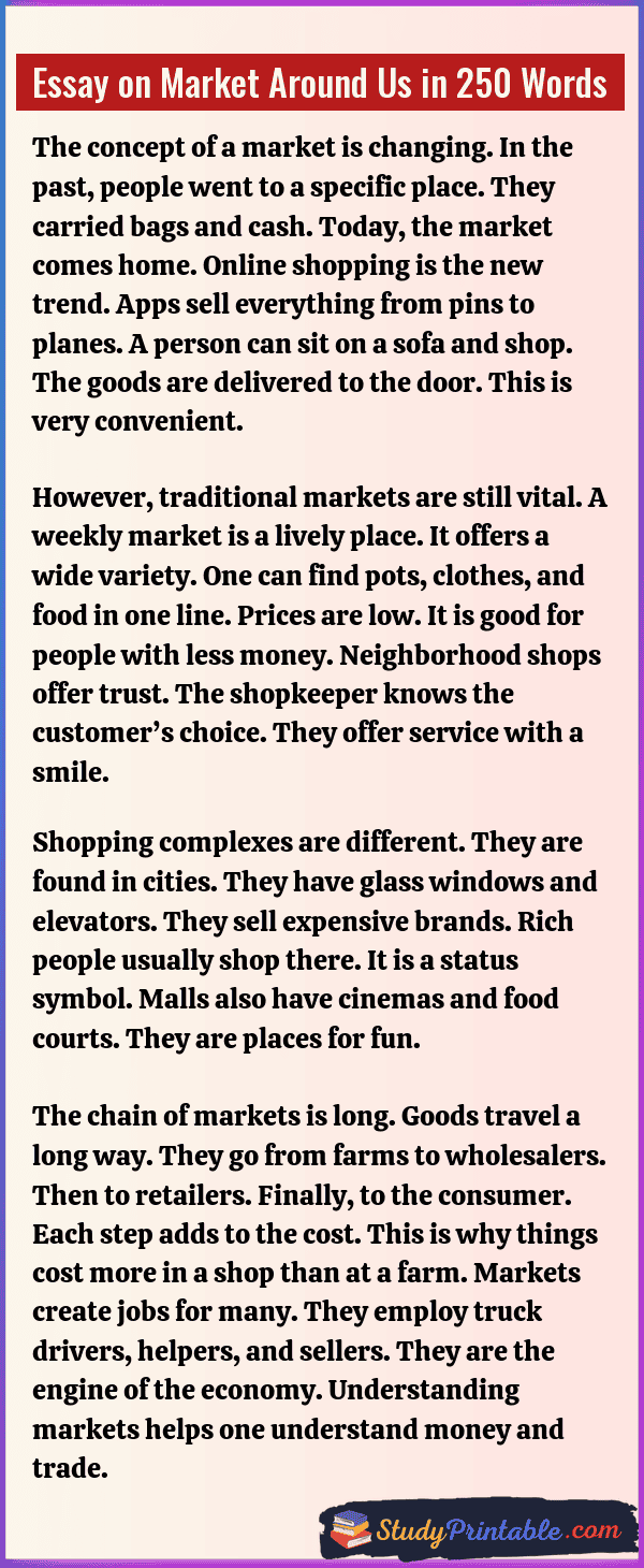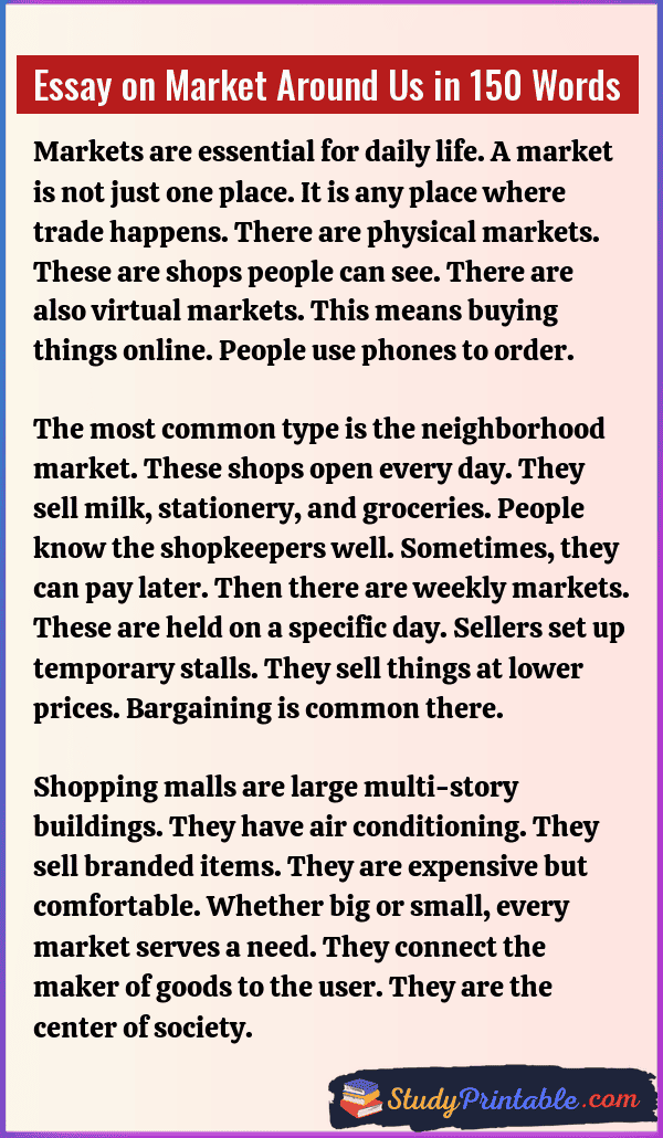 A market is a busy place. It is where buyers meet sellers. People visit markets to buy food, clothes, and toys. It is the heart of a town. Markets help people get what they need. They also help sellers earn money. From small stalls to big malls, markets are everywhere. They keep daily life moving. These essays are written for students in classes 1 to 12.