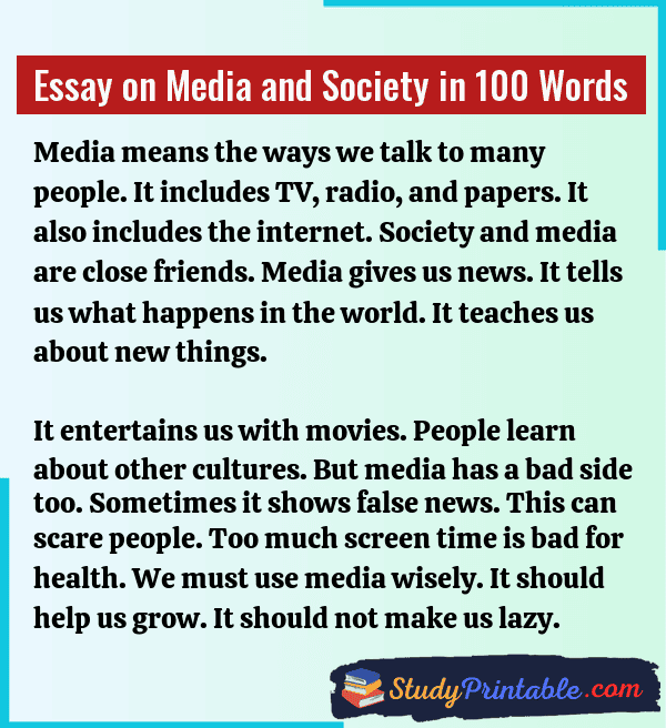 Media means the ways we talk to many people. It includes TV, radio, and papers. It also includes the internet. Society and media are close friends. Media gives us news. It tells us what happens in the world. It teaches us about new things.