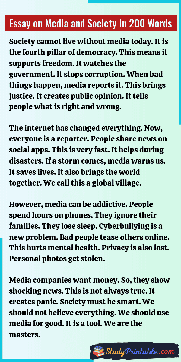 Society cannot live without media today. It is the fourth pillar of democracy. This means it supports freedom. It watches the government. It stops corruption. When bad things happen, media reports it. This brings justice. It creates public opinion. It tells people what is right and wrong.