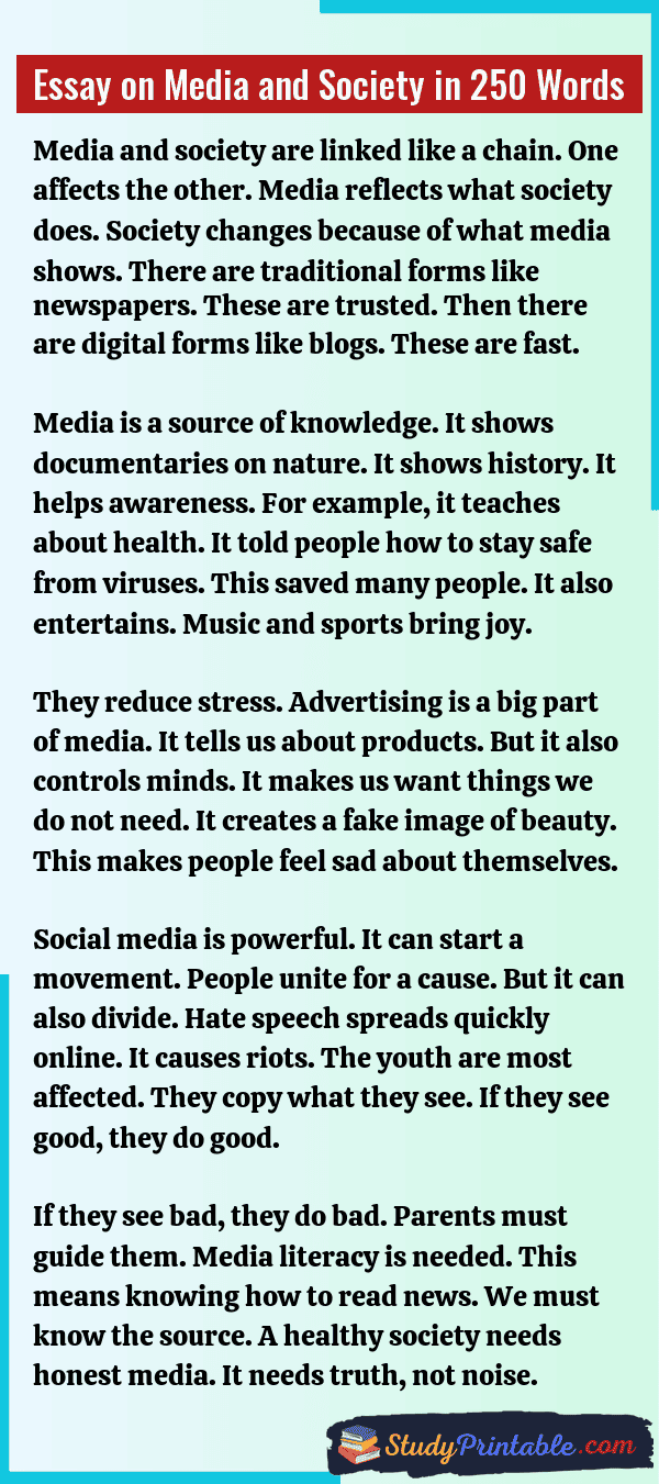 Media is like a big mirror. It shows us the world. It connects people far away. We watch news on TV. We read stories on phones. It changes how we think. It changes how we act. It is very powerful today. Society depends on it for truth. These essays are written for students in classes 1 to 12.
