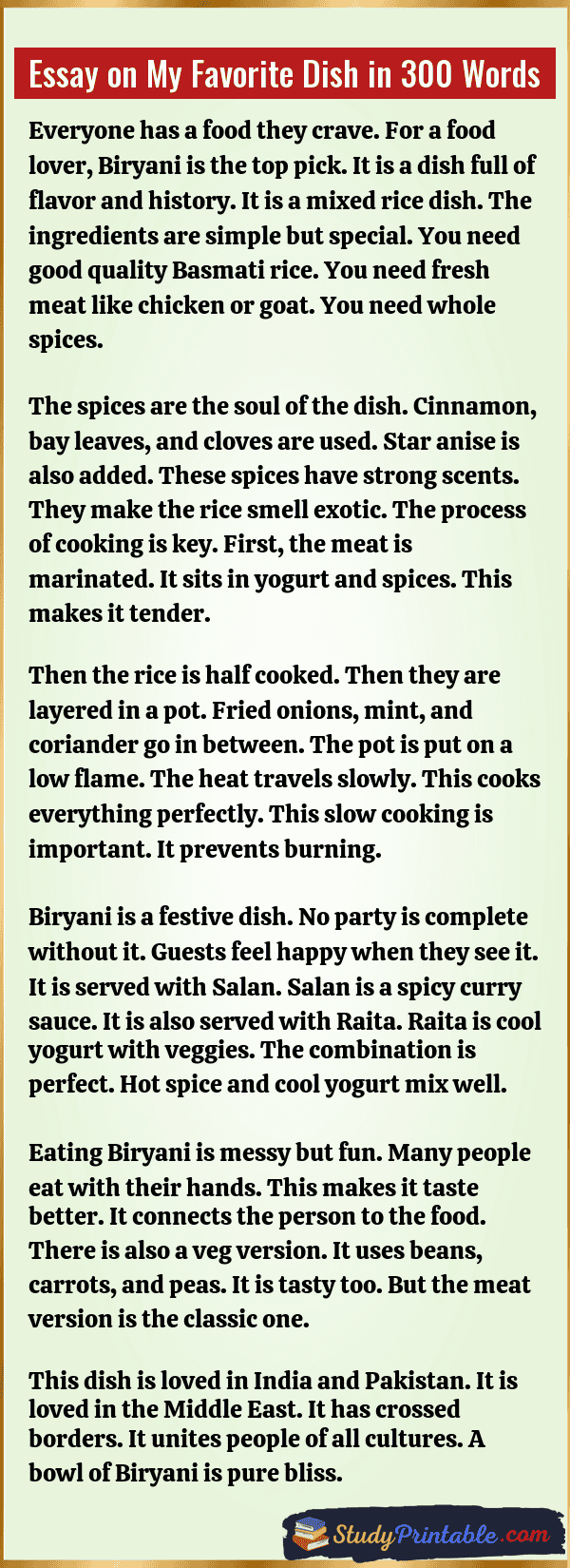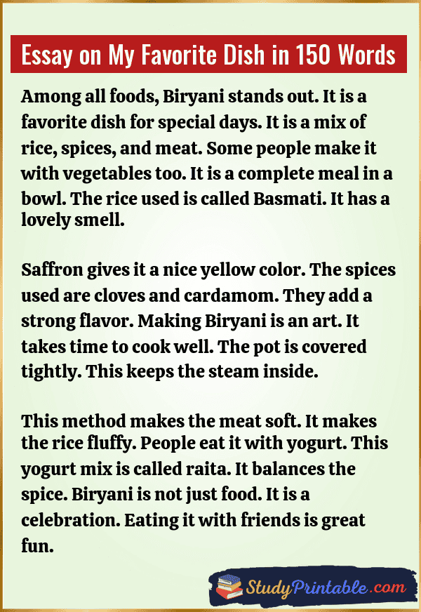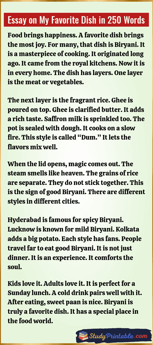 Food is very important for life. It gives energy and strength. But food is also about taste and joy. Everyone has a dish they love the most. Good food brings a smile to the face. It brings families together at the table. Eating a favorite meal is a happy moment. These essays are written for students in classes 1 to 12.