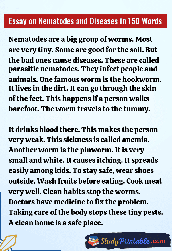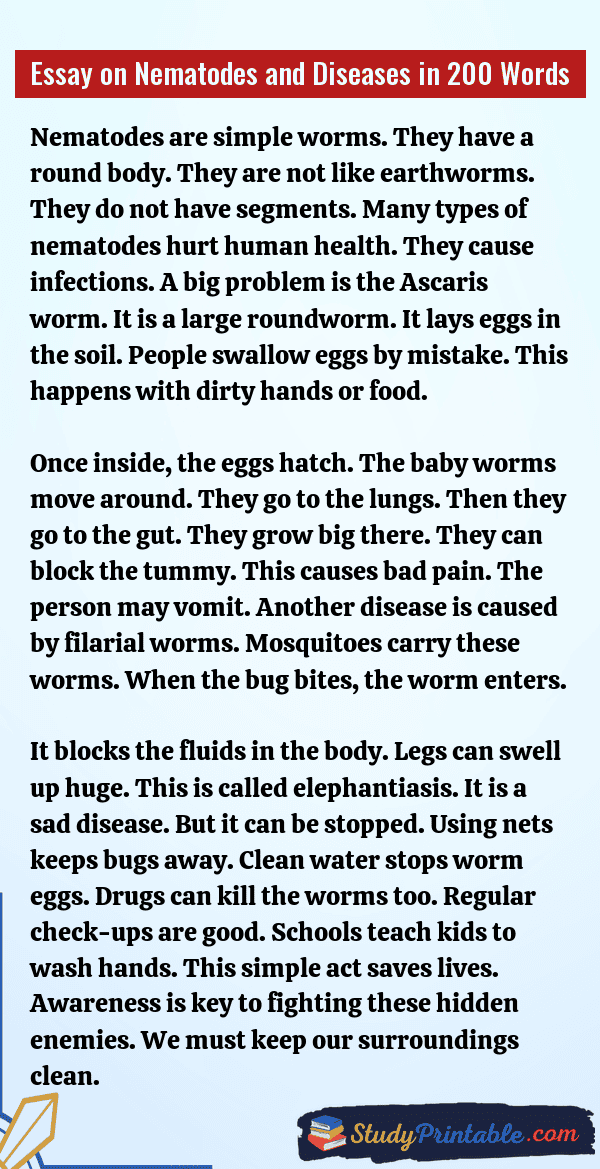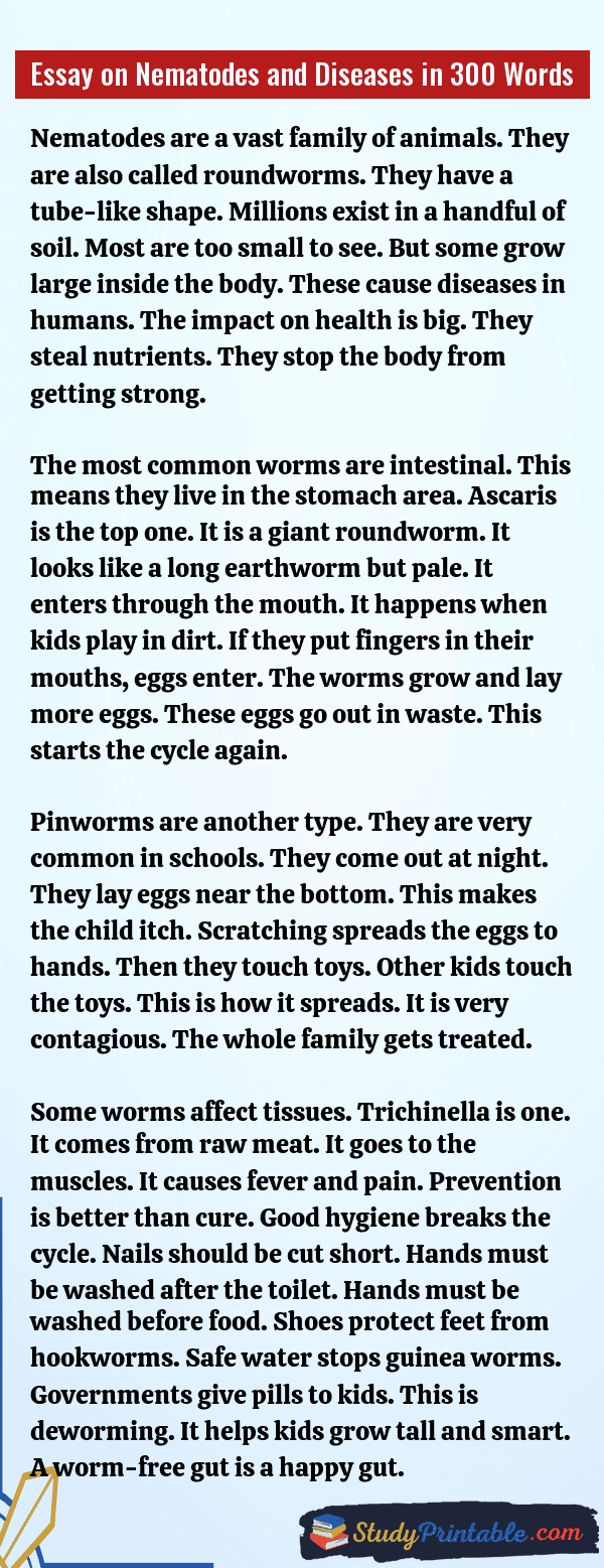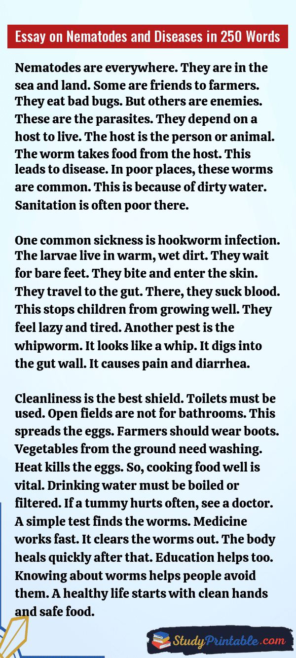 Nematodes are tiny worms. They are very small. You often cannot see them. Some live in the soil. Some live in water. Many are harmless. But some are bad germs. They get inside the body. They cause sickness and pain. They make the tummy hurt. Staying clean is the best way to stop them. Good habits keep us safe. These essays are written for students in classes 1 to 12.