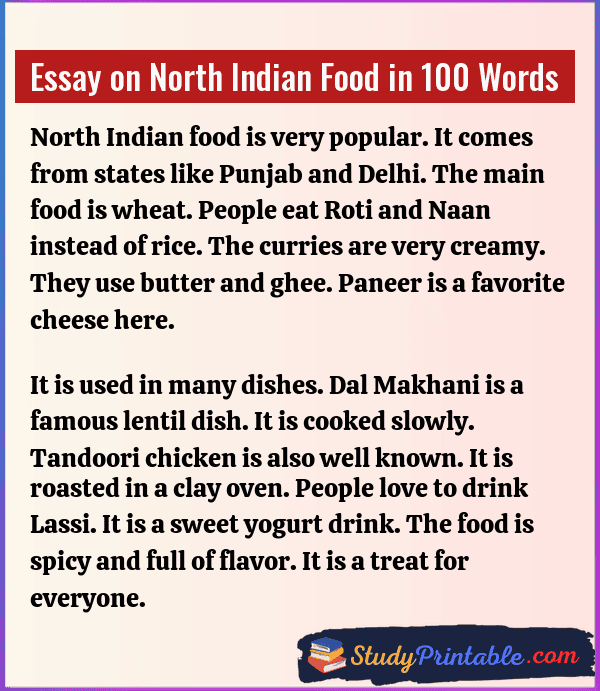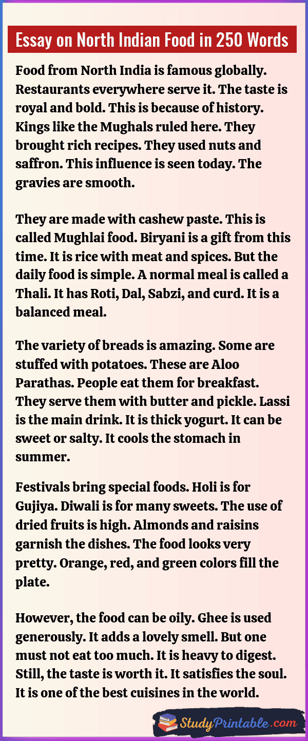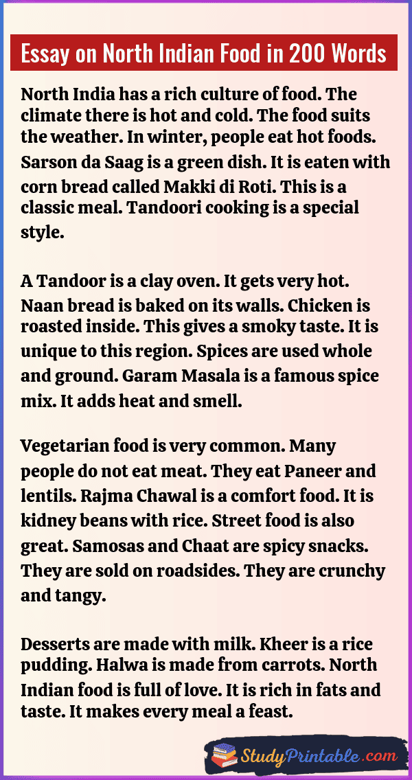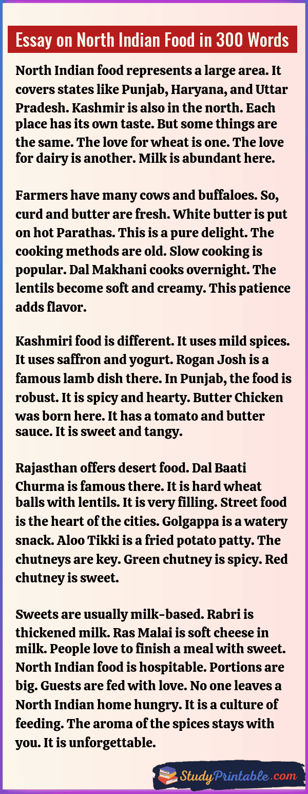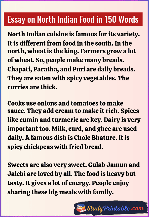 North Indian food is known all over the world. It is very rich and tasty. It uses a lot of wheat and milk. The gravies are thick and creamy. The spices have a strong smell. It brings warmth to the body. Eating this food is a joy. It fills the tummy well. These essays are written for students in classes 1 to 12.