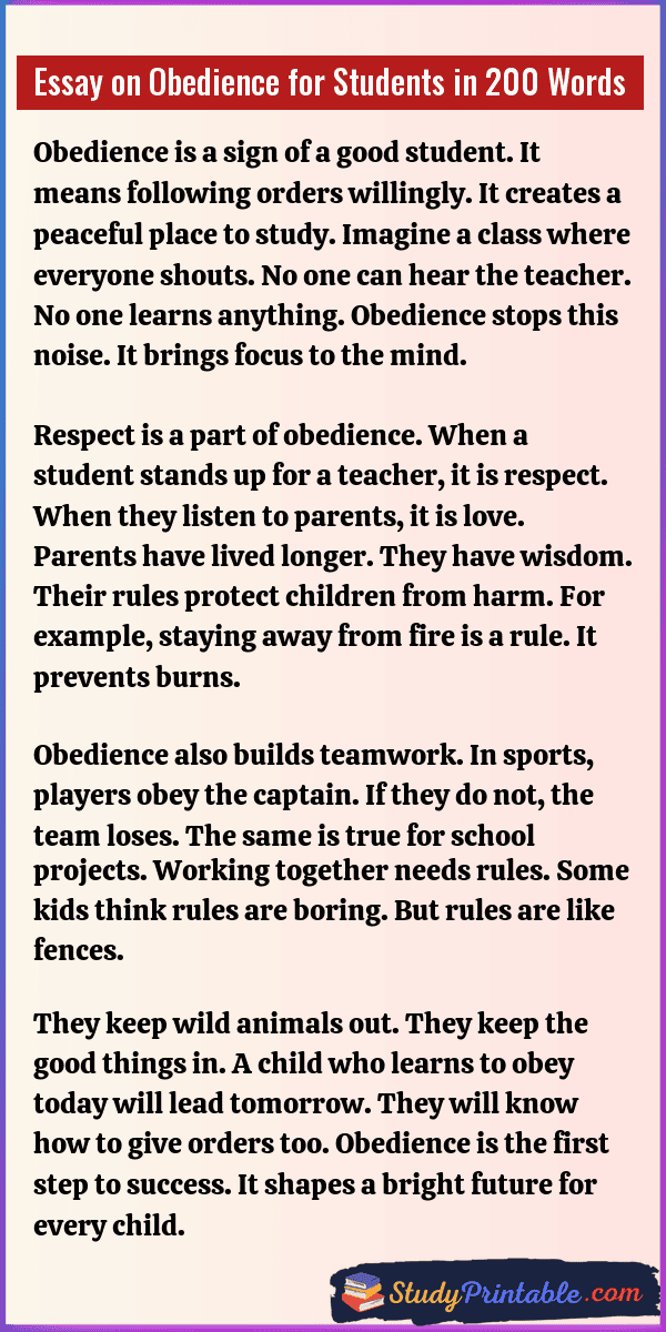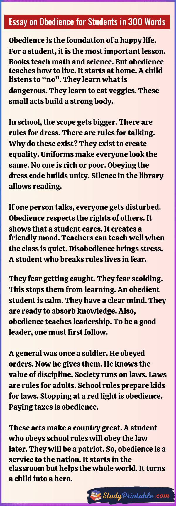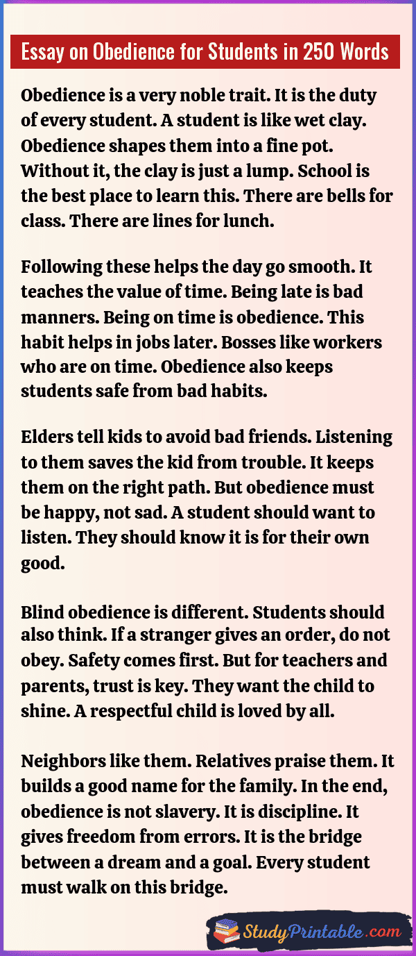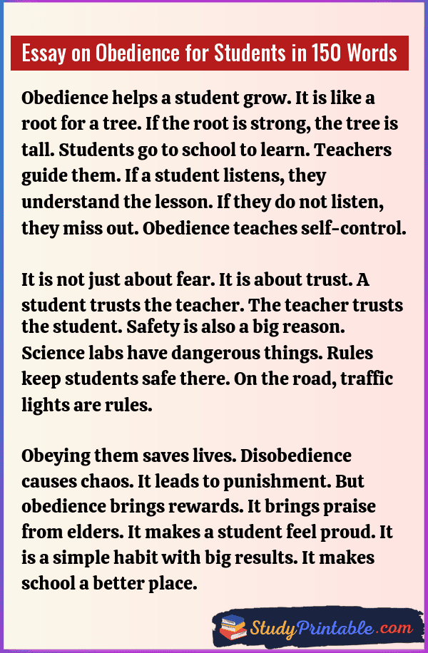 Obedience is a golden rule for life. It guides students on the right path. Life has many rules. Following them makes life safe and happy. It helps students learn fast. It builds a strong character. Teachers love students who listen. Parents feel proud of them. Obedience brings success in the future. These essays are written for students in classes 1 to 12.