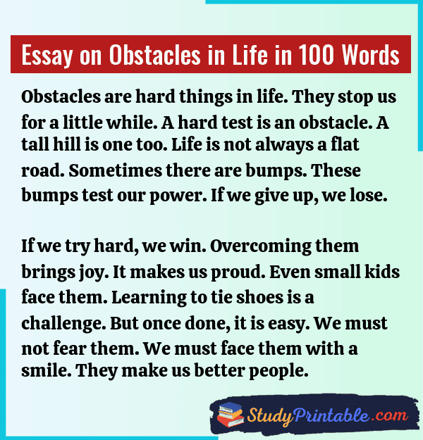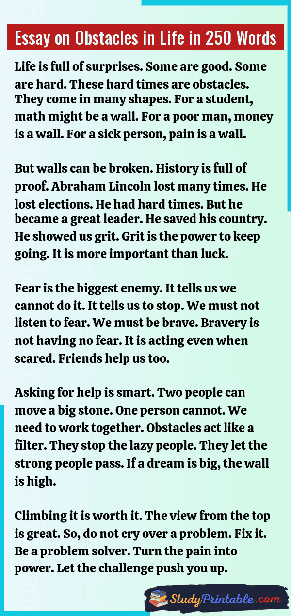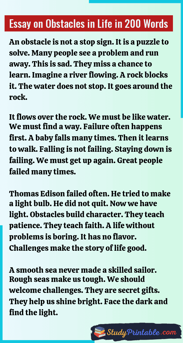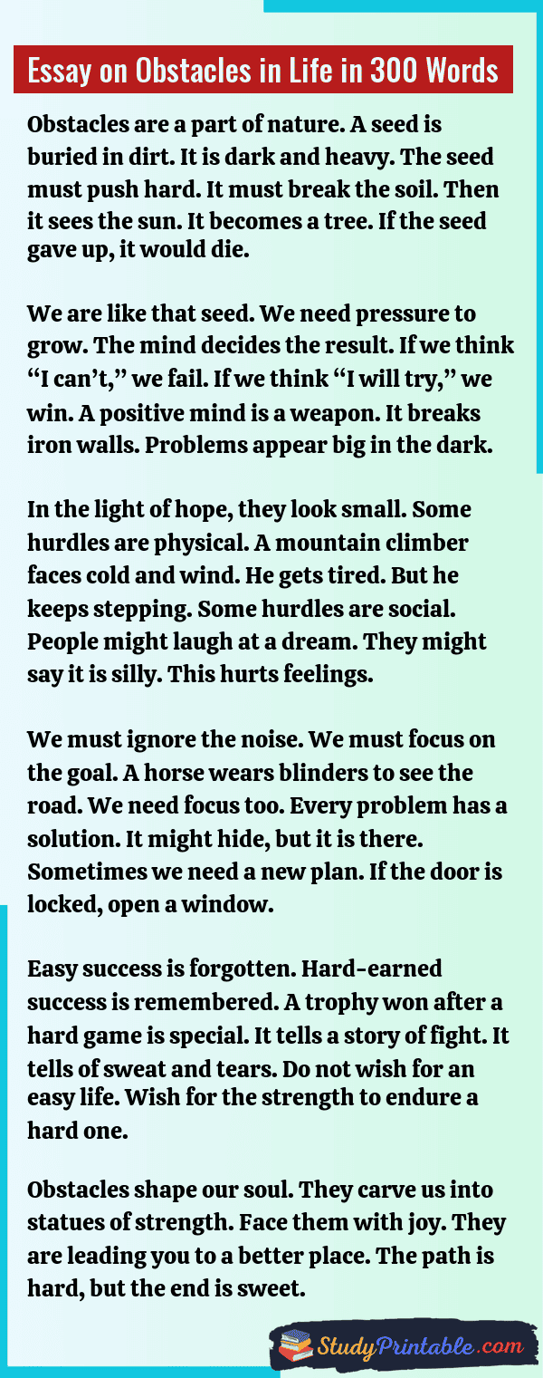 Obstacles are like big walls in our path. Everyone faces them. They can be hard work or bad luck. But they are not bad things. They teach us to be strong. We learn to jump over them. Without them, we do not grow. We stay the same. Facing a problem makes us brave. Success feels sweeter after a fight. These essays are written for students in classes 1 to 12.
