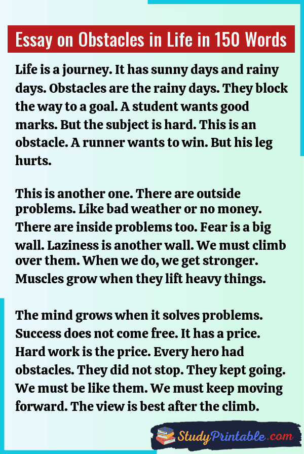 Life is a journey. It has sunny days and rainy days. Obstacles are the rainy days. They block the way to a goal. A student wants good marks. But the subject is hard. This is an obstacle. A runner wants to win. But his leg hurts.