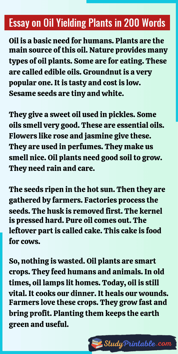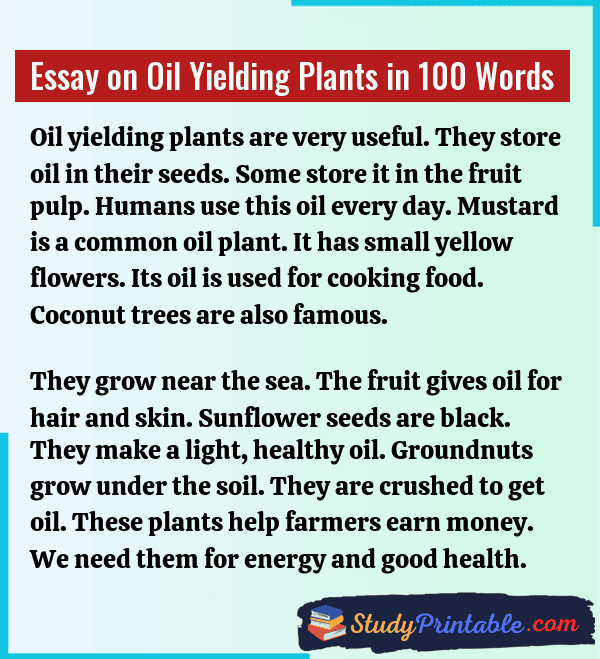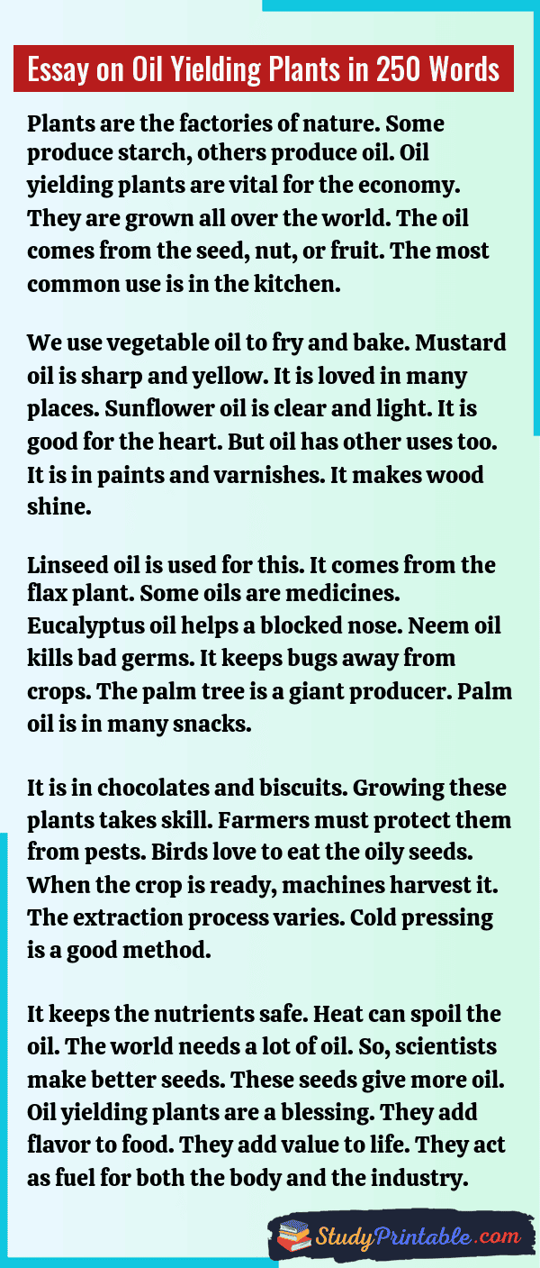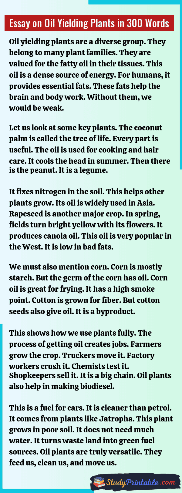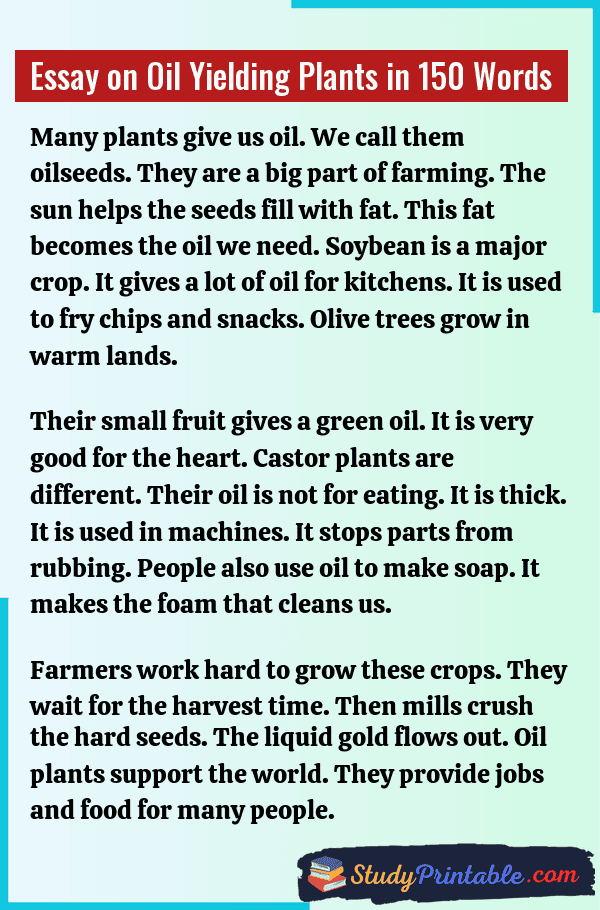 Plants are amazing gifts from nature. Some plants give us oil. This oil is found in seeds or fruits. We use it to cook yummy food. We use it to make hair soft. It also helps machines run well. Farmers grow these plants in big fields. They are very important for life. These essays are written for students in classes 1 to 12.