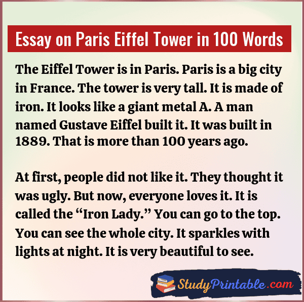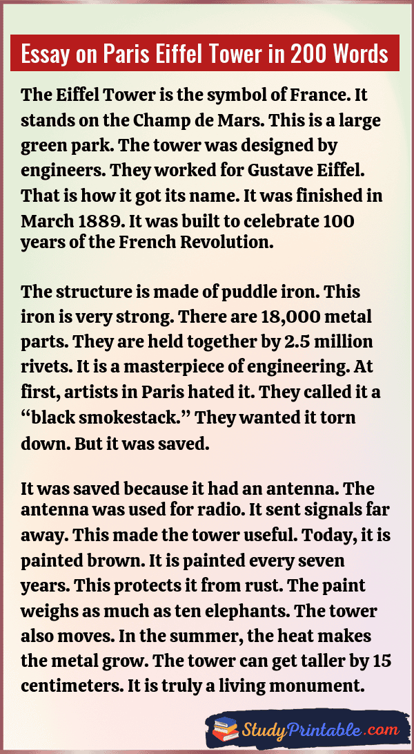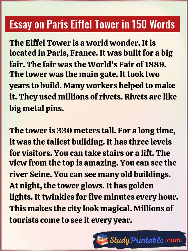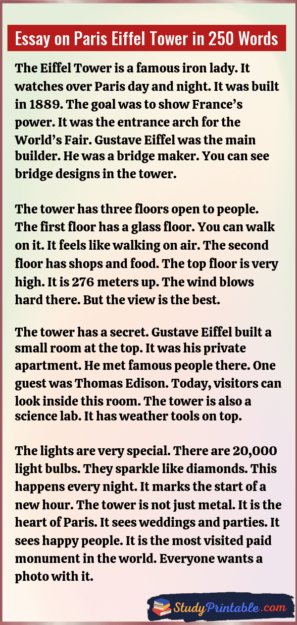 The Eiffel Tower is a famous landmark. It stands tall in Paris, France. People from all over the world visit it. It is made of strong iron. It was built a long time ago. It shows how smart engineers are. It is a symbol of beauty and art. These essays are written for students in classes 1 to 12.