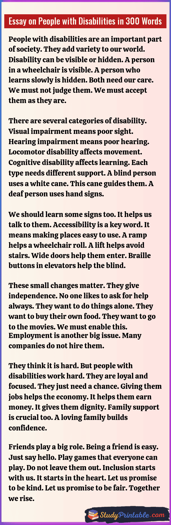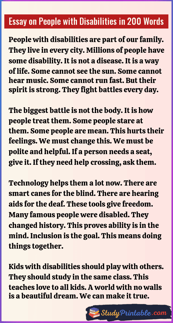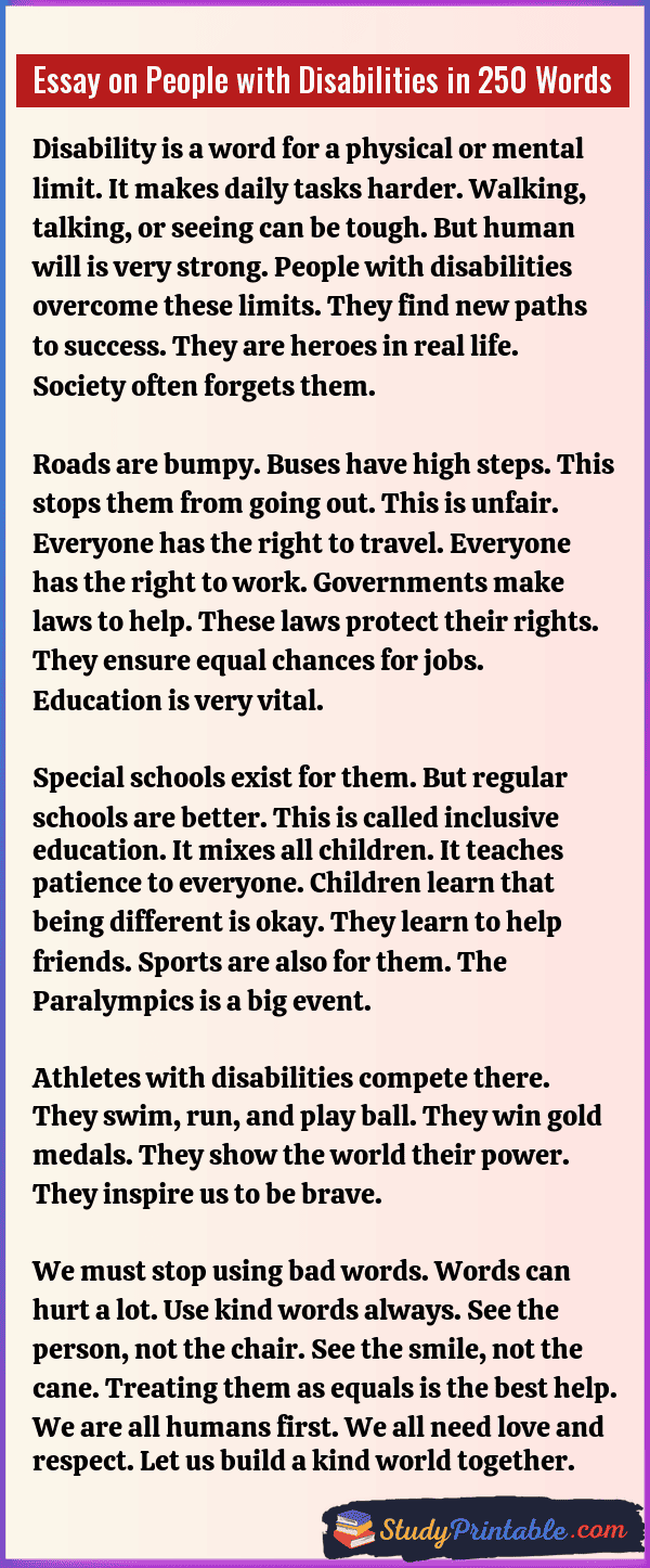 People with disabilities are very special. They are strong and brave. Some cannot walk well. Some cannot see or hear. But they have big hearts. They can do great things. We must treat them with love. We must help them shine. The world needs their unique gifts. Respect is very important. These essays are written for students in classes 1 to 12.