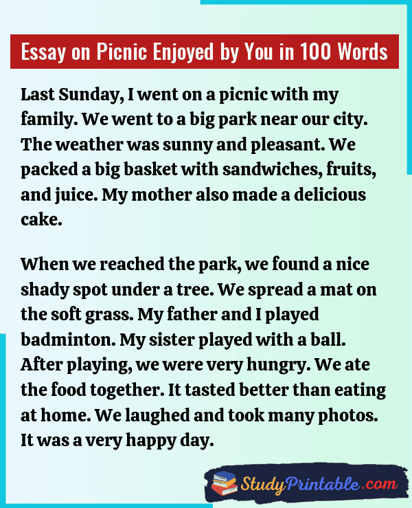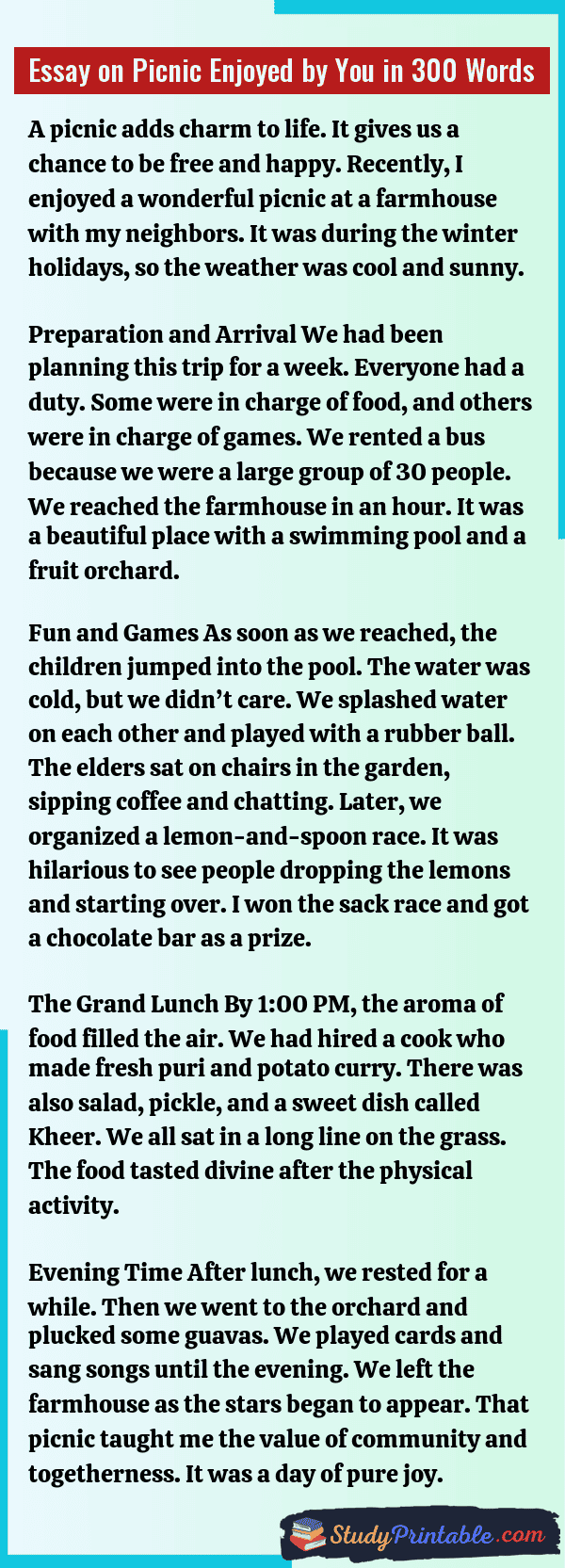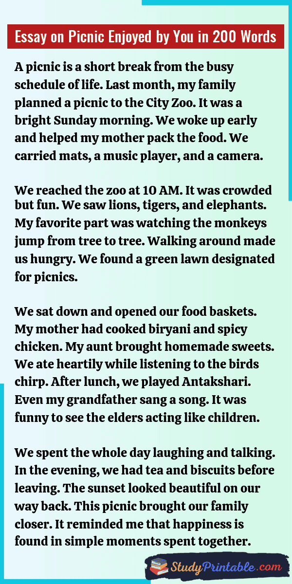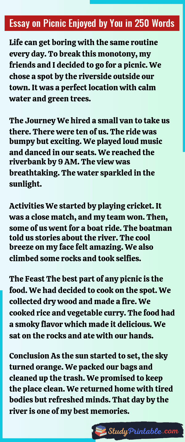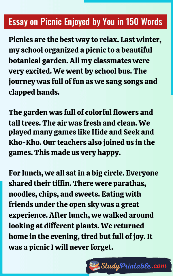 A picnic is a wonderful escape from the daily routine of school and homework. It is a time to enjoy nature, eat good food, and spend quality time with family or friends. Whether it is a sunny day at the park or a trip to a riverbank, the joy of eating outdoors is special. It refreshes the mind and creates happy memories that last forever. The following essays are written for students from Class 1 to Class 12.