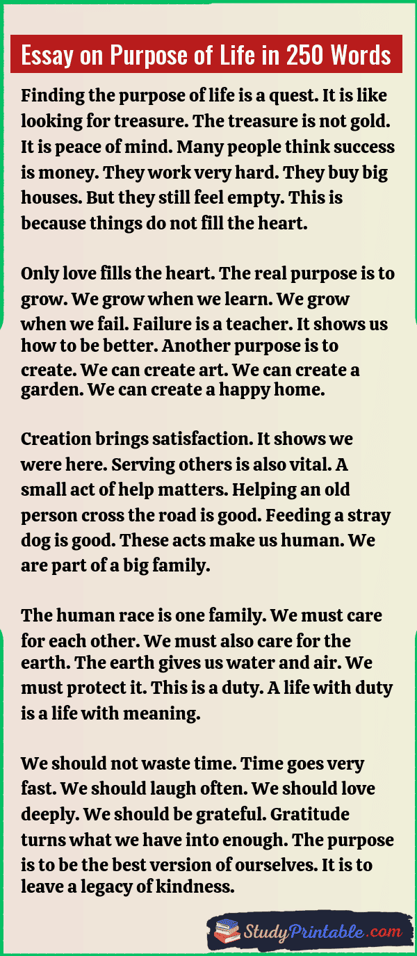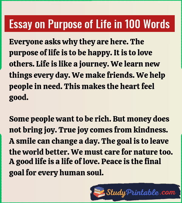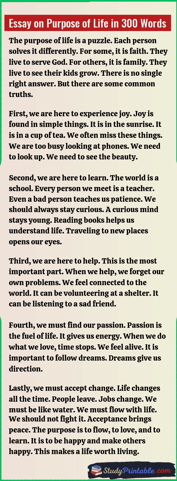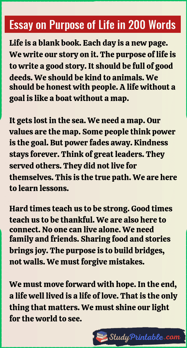 Every person wonders why they are here. Life is a beautiful journey. It is full of secrets. Finding a reason to live makes us happy. It gives us a clear path. Without a goal, we might feel lost. A purpose helps us make good choices. It helps us help others. These essays are written for students in classes 1 to 12.