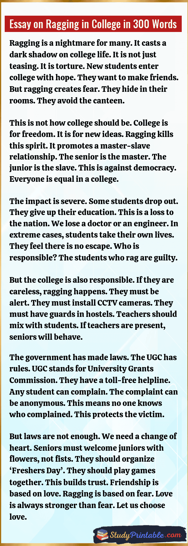 College life should be a happy time. It is a time to learn and grow. But ragging spoils this joy. It creates fear in new students. It hurts them in body and mind. We must stop this bad practice. Every student deserves respect. A safe campus is a happy campus. We need strict rules to end it. These essays are written for students in classes 1 to 12.