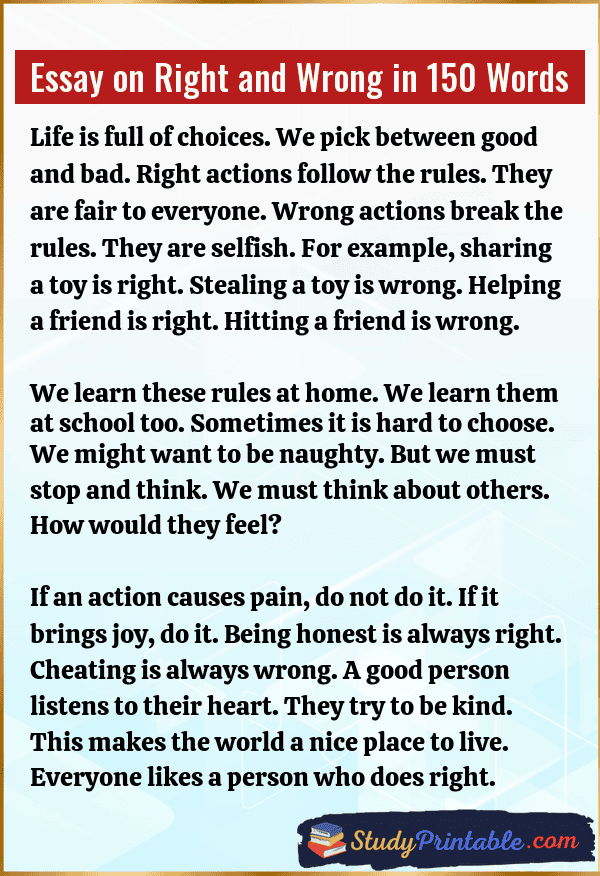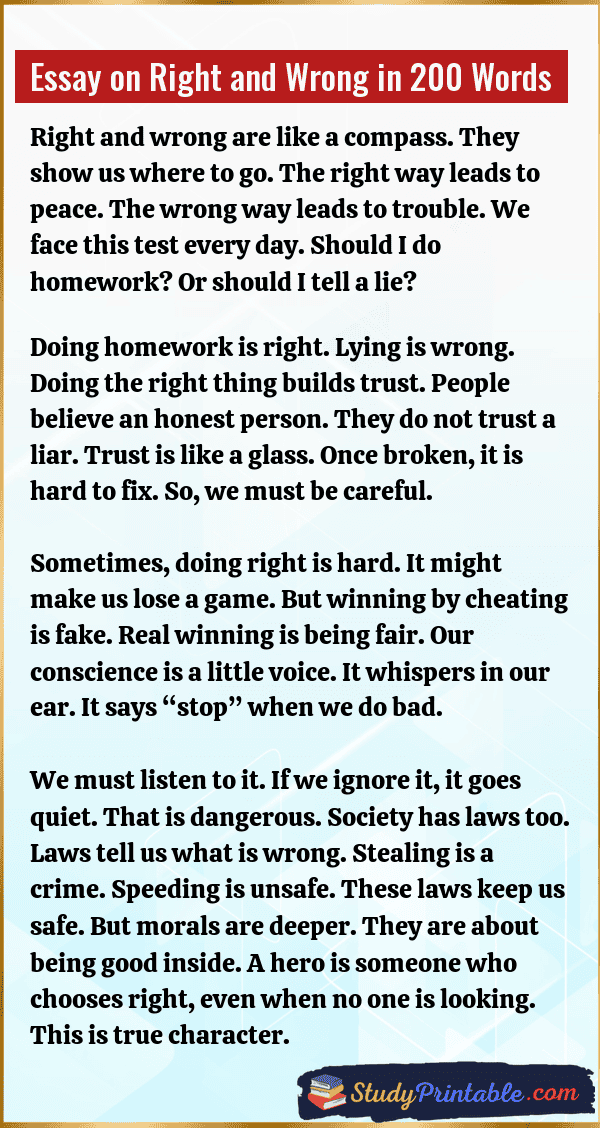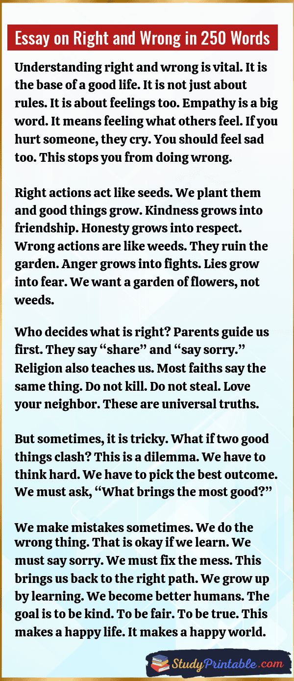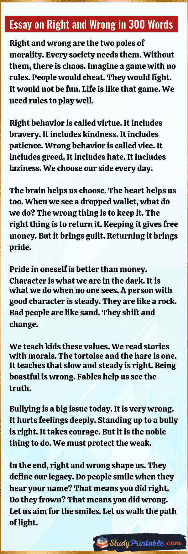 Knowing right from wrong is a big skill. It helps us be good people. It makes the world a safe place. When we do right, we feel happy. When we do wrong, we feel sad. It guides our choices every day. It builds trust with friends. Everyone needs to learn this early. These essays are written for students in classes 1 to 12.