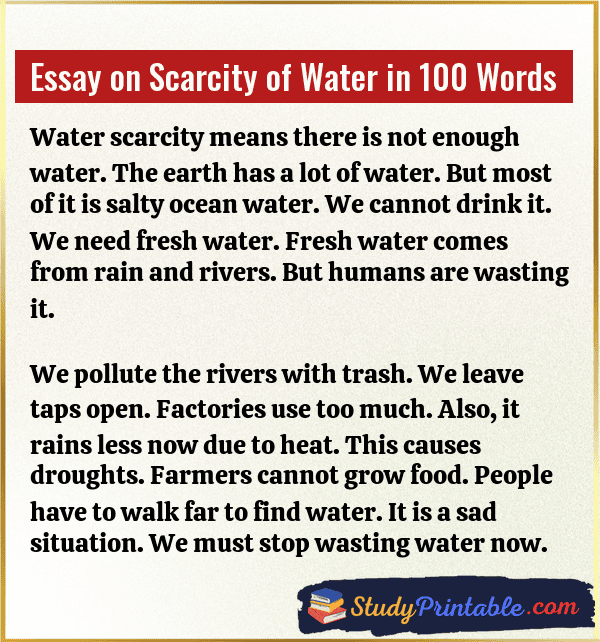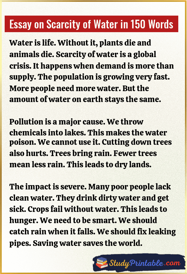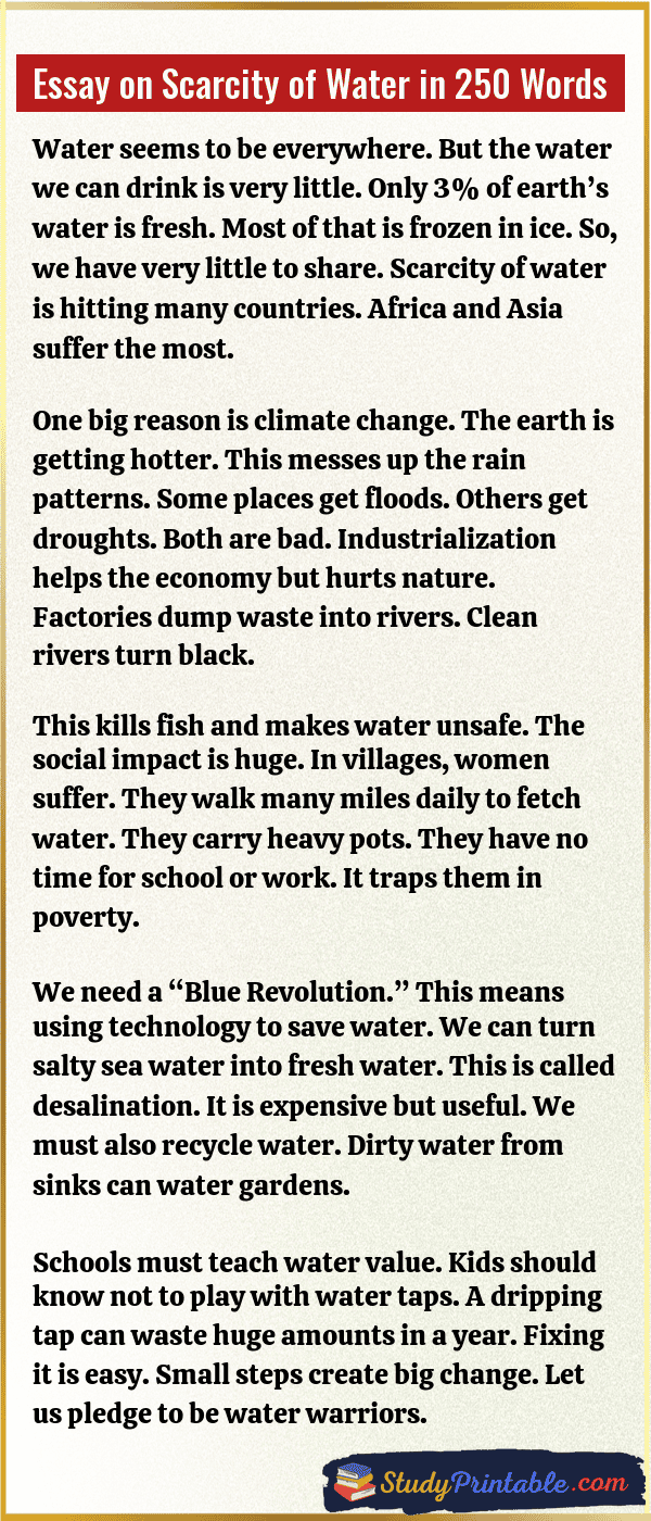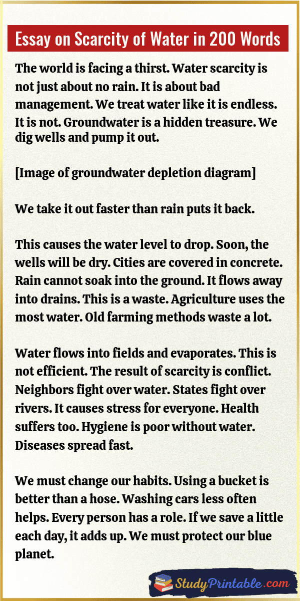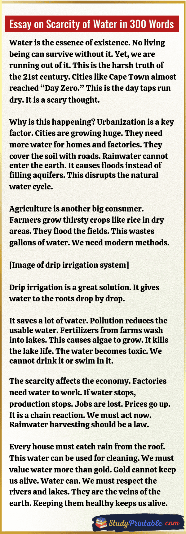 Water is the most precious gift of nature. All living things need it to survive. But today, the earth is getting dry. Rivers are shrinking and wells are empty. This problem is called water scarcity. It is a big danger for the future. If we run out, life will end. We must learn to save every drop. These essays are written for students in classes 1 to 12.