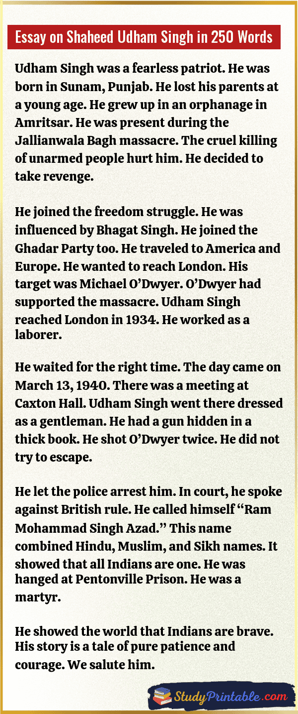 Shaheed Udham Singh was a brave hero. He loved India very much. A bad event hurt him deeply. Many people died in a park. He promised to punish the bad man. He waited for many years. Finally, he took his revenge. His story teaches us courage. He is a great martyr of the nation. These essays are written for students in classes 1 to 12.