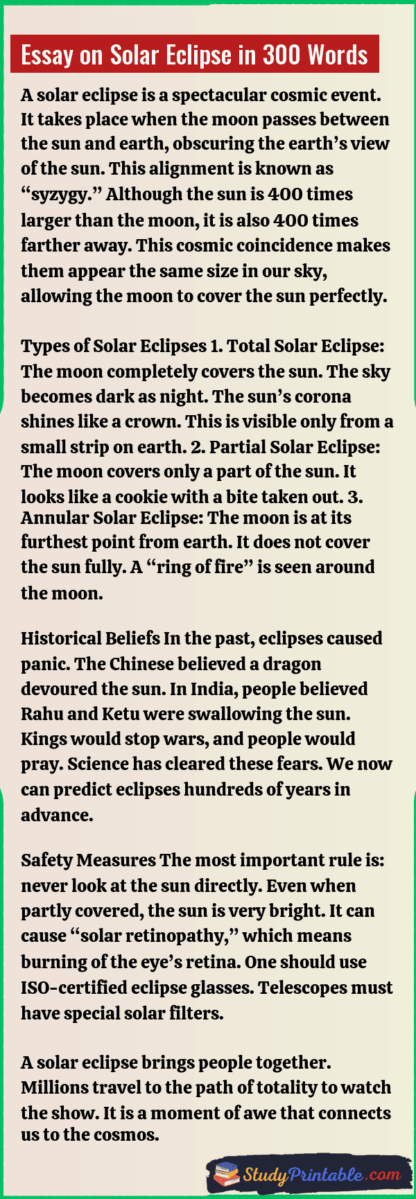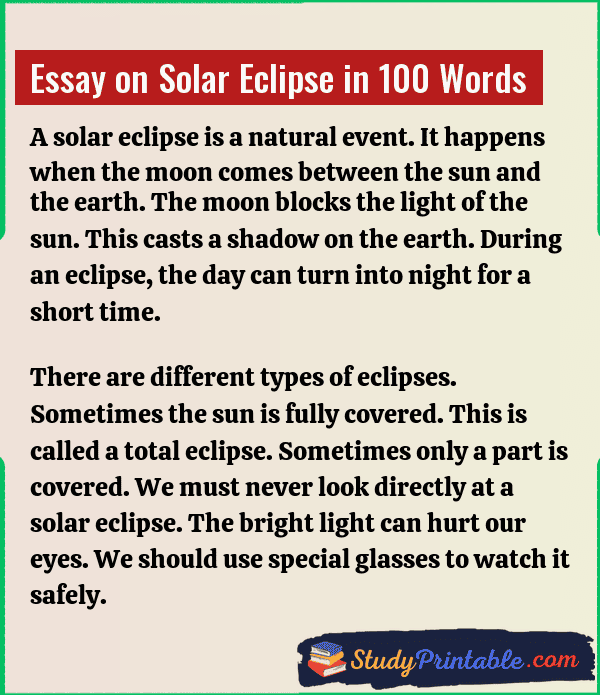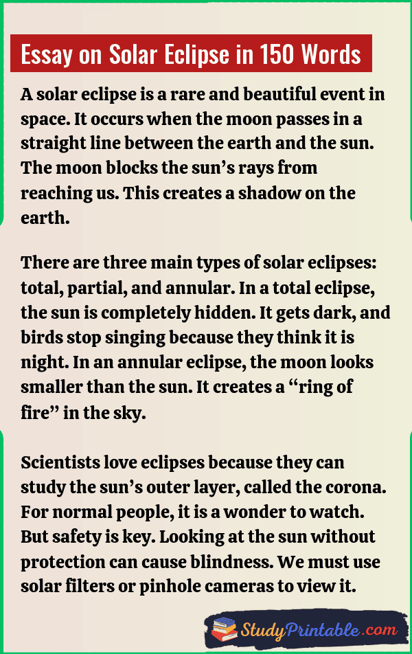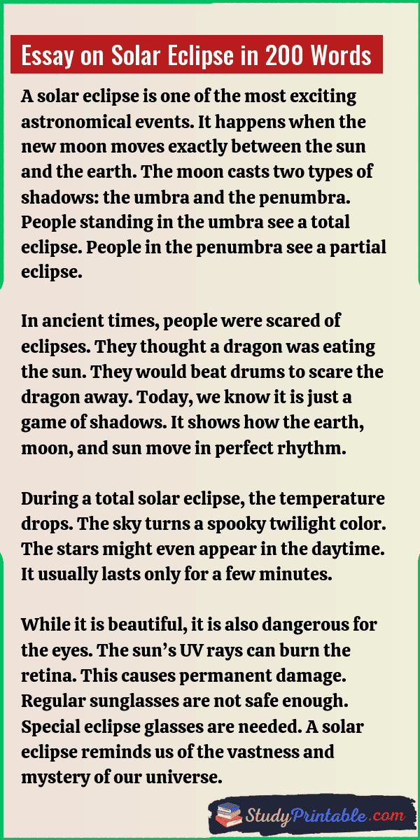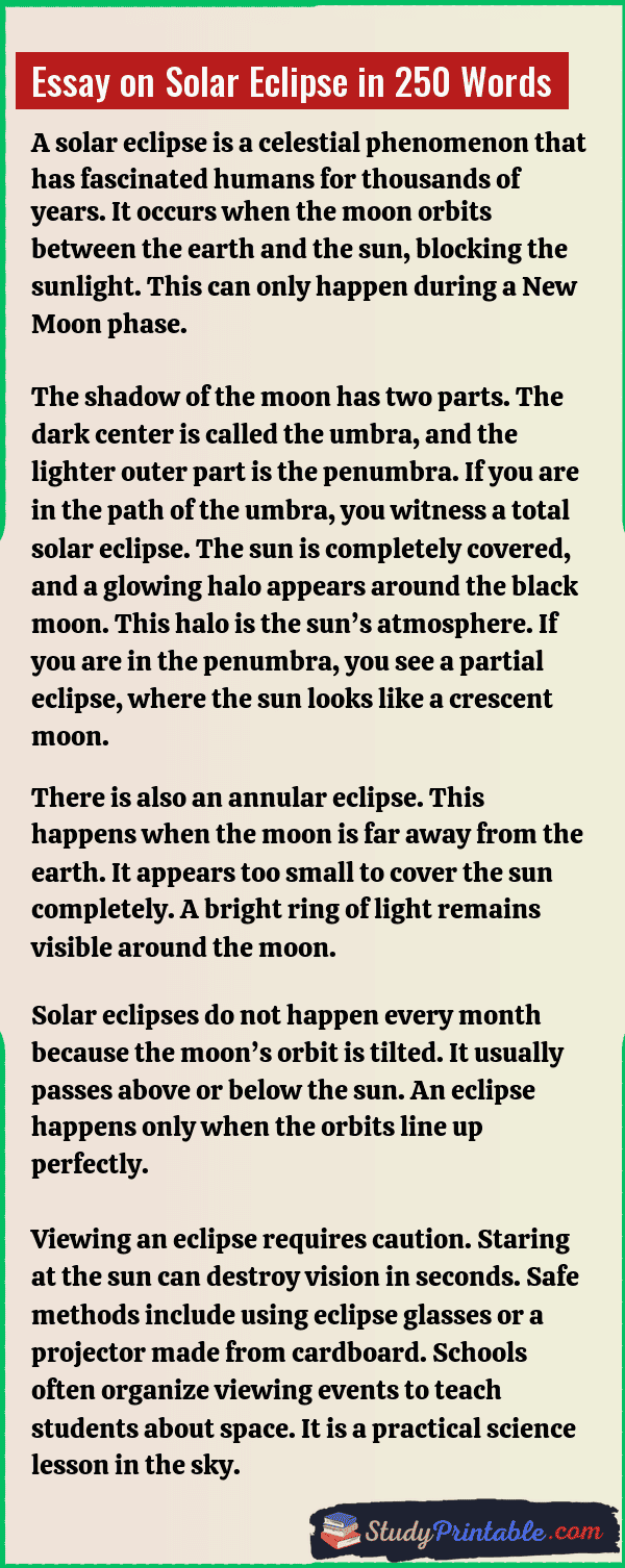 A solar eclipse is a spectacular event in the sky. It happens when the moon moves between the sun and the earth. For a few minutes, the moon covers the sun, and it gets dark in the middle of the day. It looks like a bite has been taken out of the sun. This amazing shadow play teaches us about the movement of planets. However, it is dangerous to look at it with naked eyes. The following essays are written for students from Class 1 to Class 12.