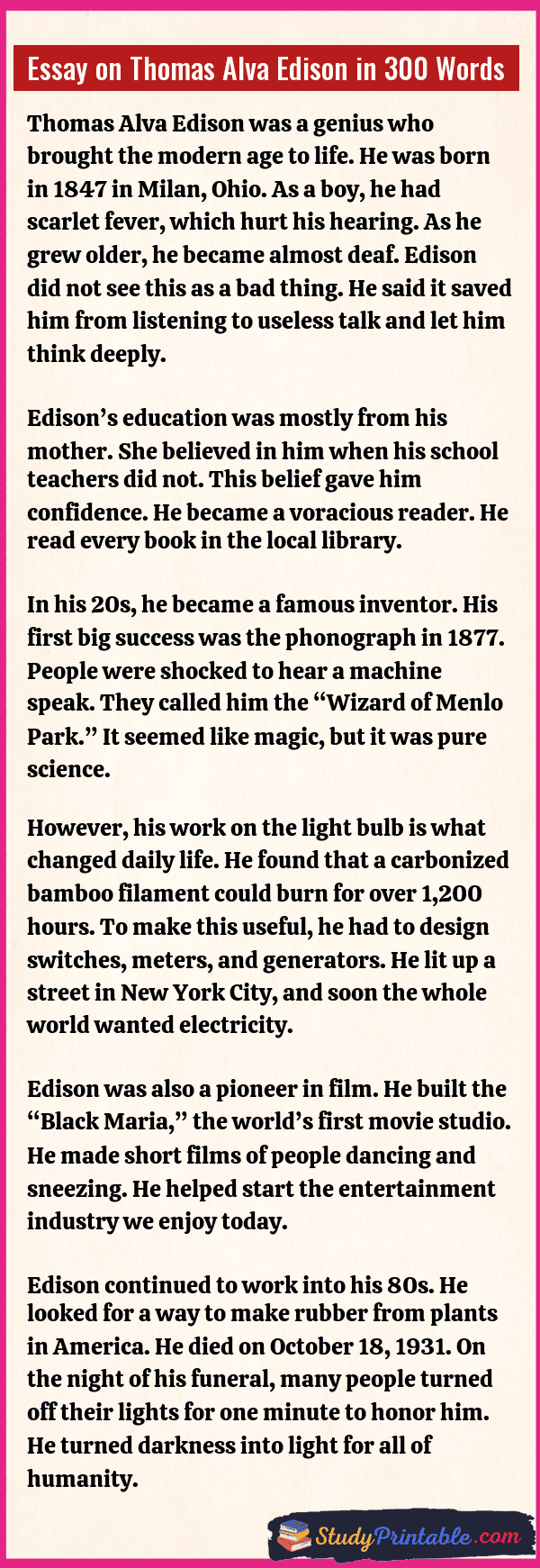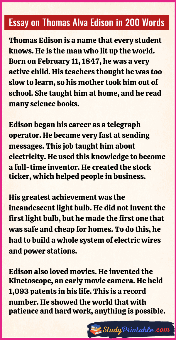 Thomas Alva Edison was one of the most famous inventors in history. He gave the world the electric light bulb, which lit up our nights. He also invented machines to record sound and show movies. He was a very hard worker who believed that failure was just a step toward success. His ideas changed the way we live today. He held over one thousand patents for his inventions. The following essays are written for students from Class 1 to Class 12.