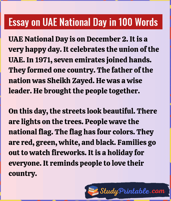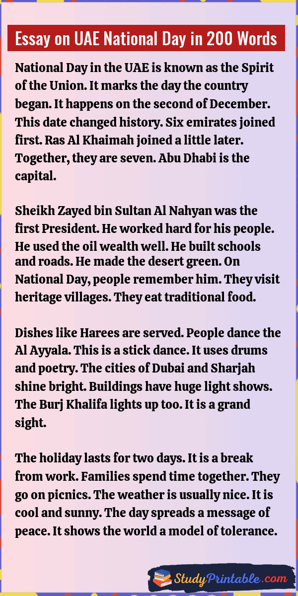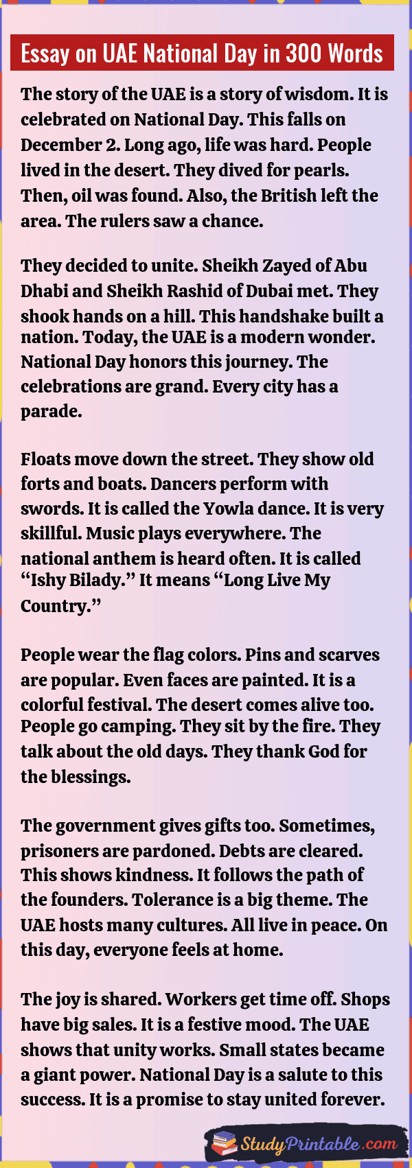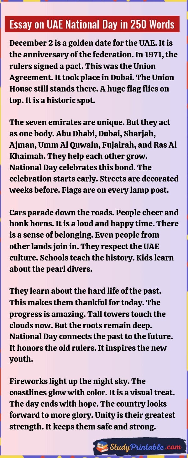 UAE National Day is a time of great pride. It marks the birth of a strong nation. Seven emirates came together as one. This happened many years ago. It showed the power of unity. The country grew fast after that. Now, it is a land of peace and wealth. People celebrate with joy. Flags fly high everywhere. These essays are written for students in classes 1 to 12.