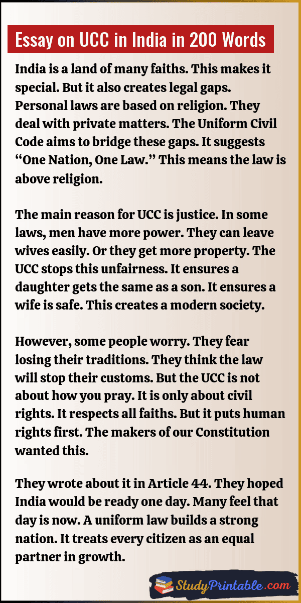 The Uniform Civil Code is a big idea for India. It wants one rule for all people. It covers marriage, money, and family. Right now, different groups have different rules. This new law aims to make things fair. It helps women and men be equal. It helps the country stay united. It creates a simple system for justice. These essays are written for students in classes 1 to 12.