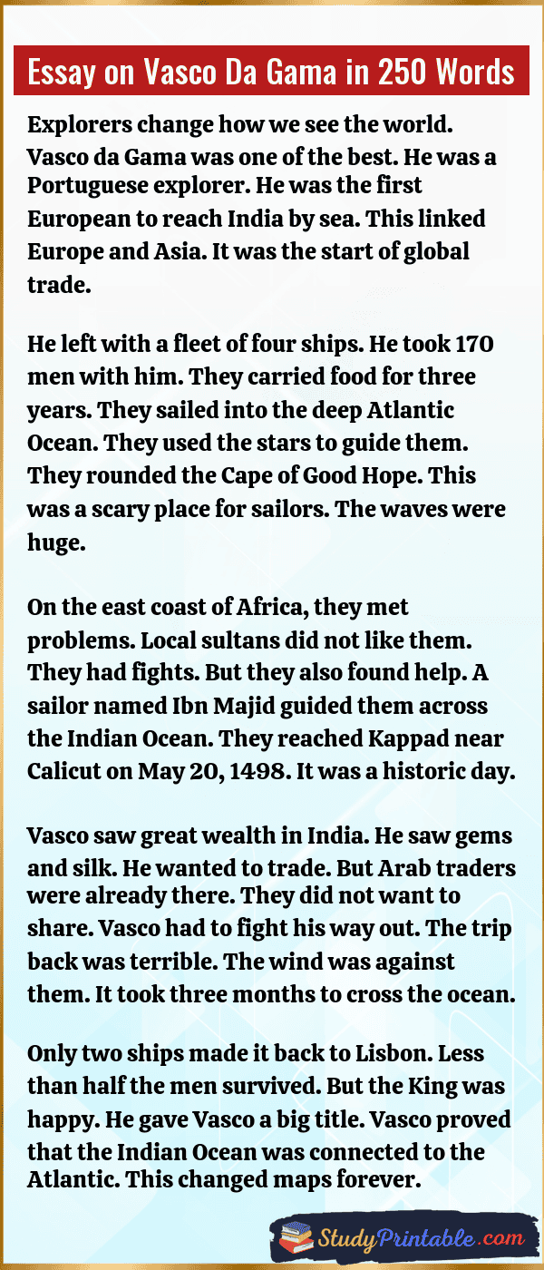 Vasco da Gama was a very brave man. He was an explorer from Portugal. He did something no one had done before. He sailed from Europe to India. He went around Africa to do this. This journey changed the world. It opened a new path for trade. Spices became easy to get. His trip connected the East and the West. These essays are written for students in classes 1 to 12.