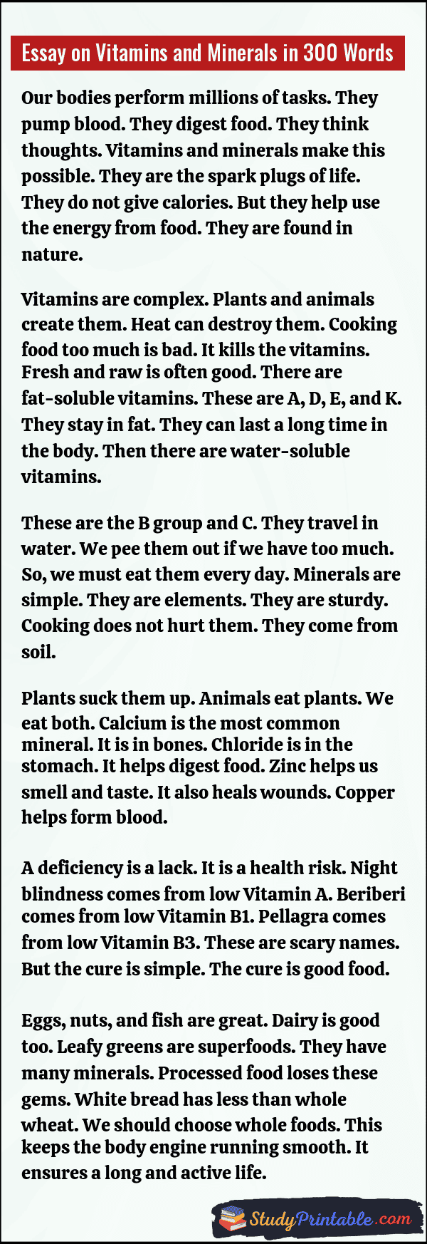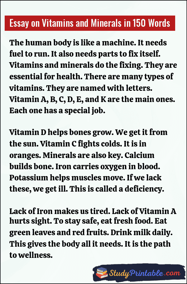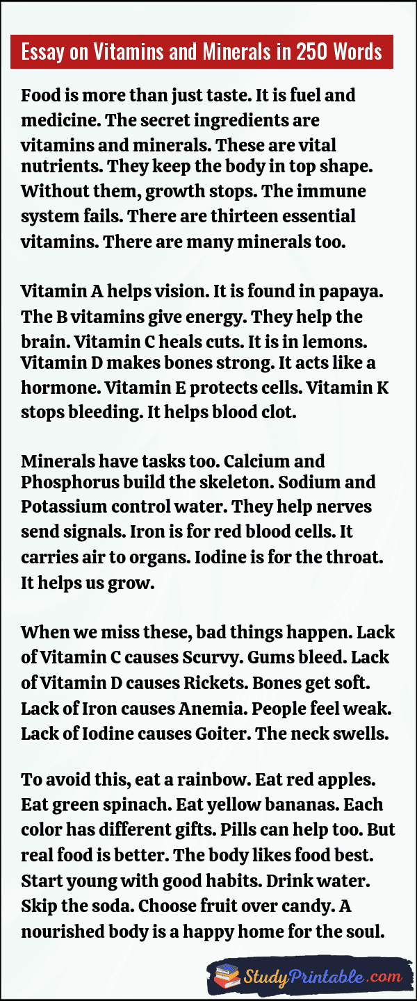 Vitamins and minerals are like tiny magic keys. They unlock energy in the body. They are found in the food we eat. We cannot see them with our eyes. But they do very big jobs. They build strong bones. They help us see in the dark. They keep the skin smooth. They fight off bad germs. Without them, the body gets weak. Sickness can happen easily. Eating many colors of food is best. It keeps us fit and happy. These essays are written for students in classes 1 to 12.