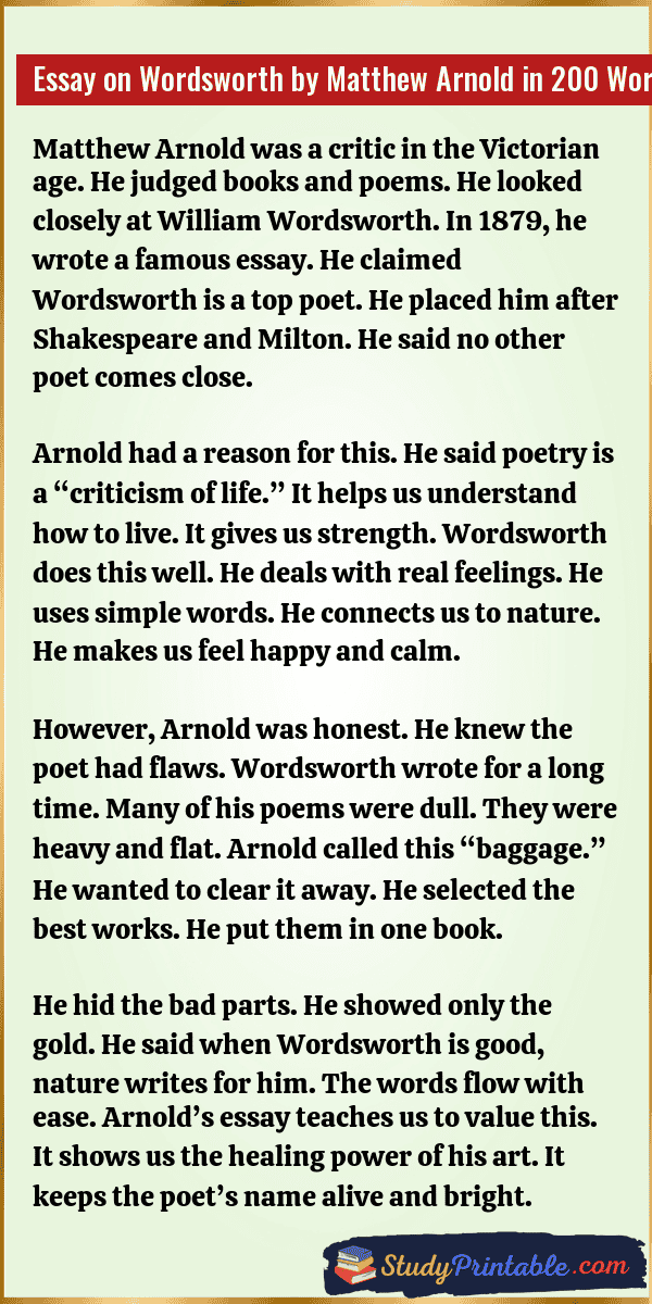 Matthew Arnold wrote a famous essay. It was about a poet named Wordsworth. Arnold loved his work. He said Wordsworth was very important. He ranked him very high. He said his poems help us live. They heal our minds. Arnold picked the best poems for us. This writing changed how we see poetry. It is a key text for students. These essays are written for classes 1 to 12.