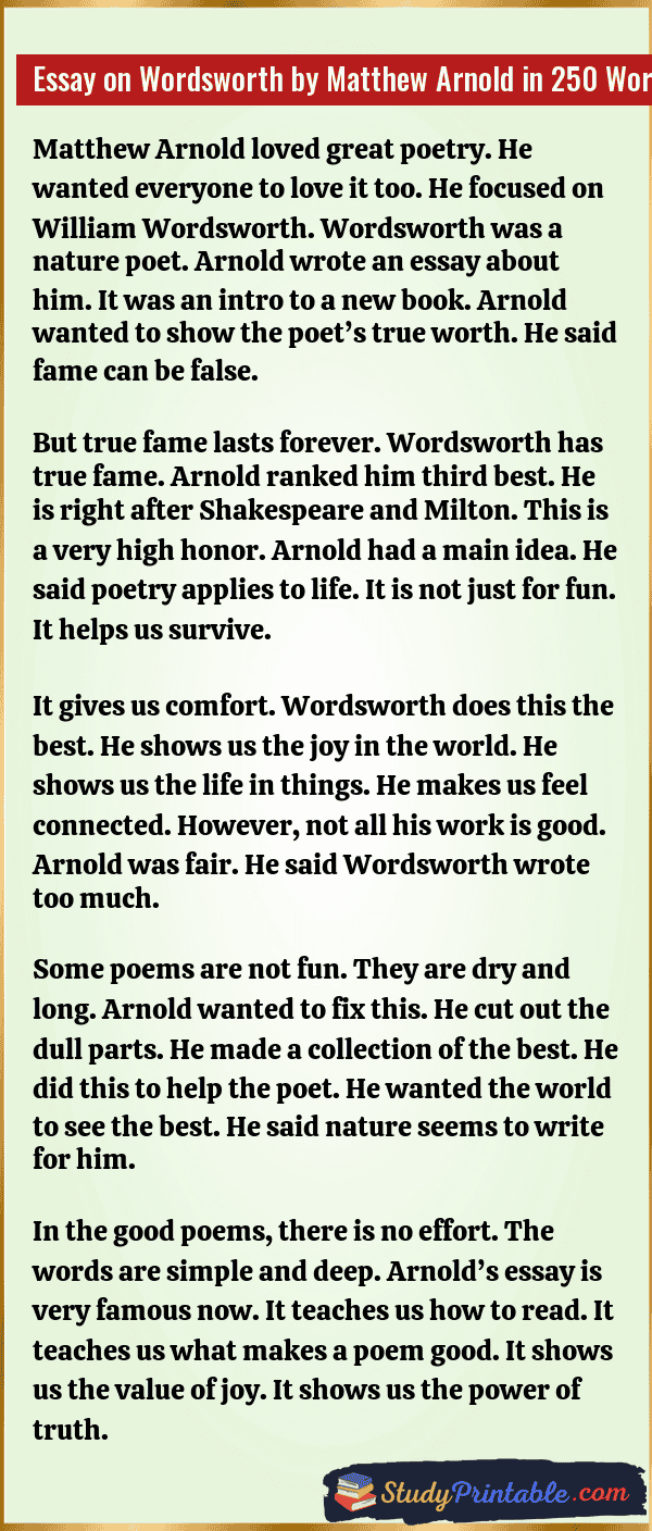 Essay on Wordsworth by Matthew Arnold in 250 Words