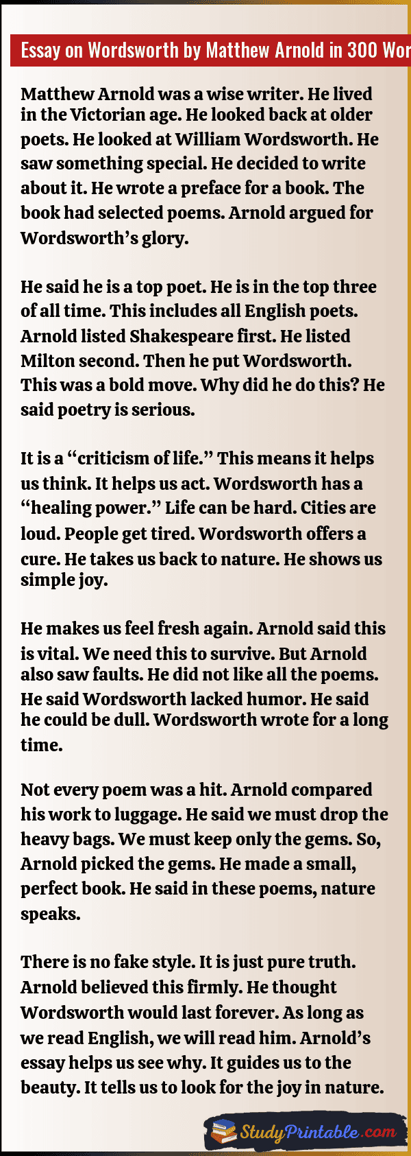 Matthew Arnold wrote a famous essay. It was about a poet named Wordsworth. Arnold loved his work. He said Wordsworth was very important. He ranked him very high. He said his poems help us live. They heal our minds. Arnold picked the best poems for us. This writing changed how we see poetry. It is a key text for students. These essays are written for classes 1 to 12.