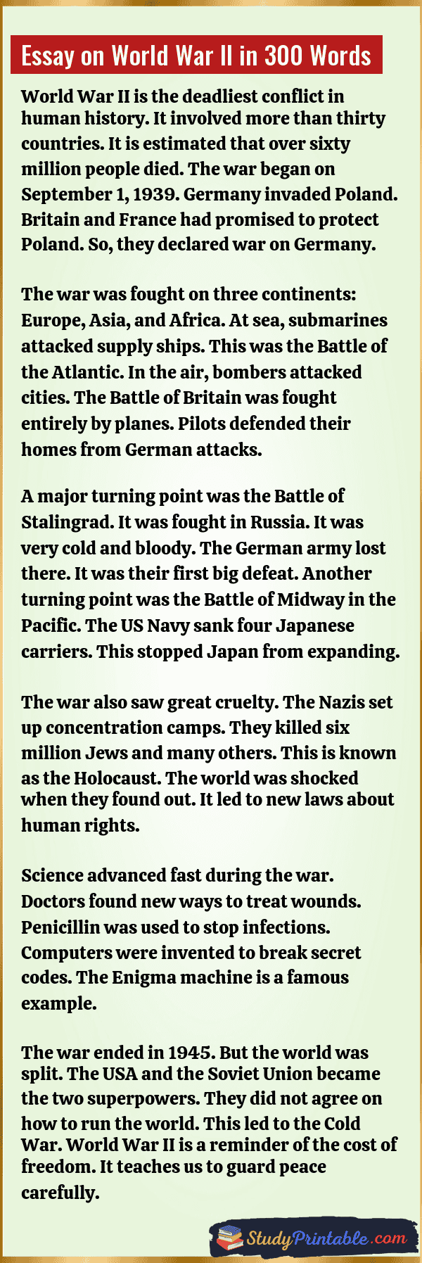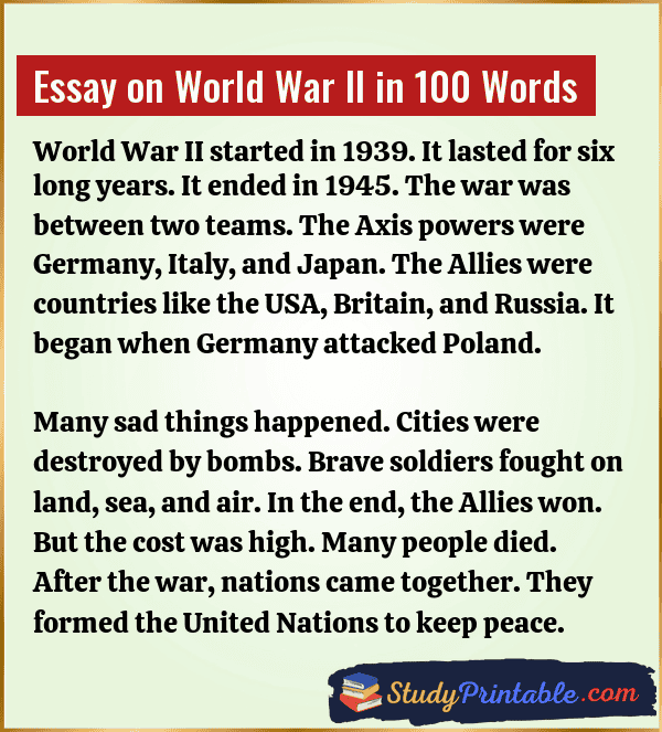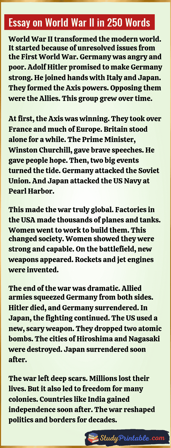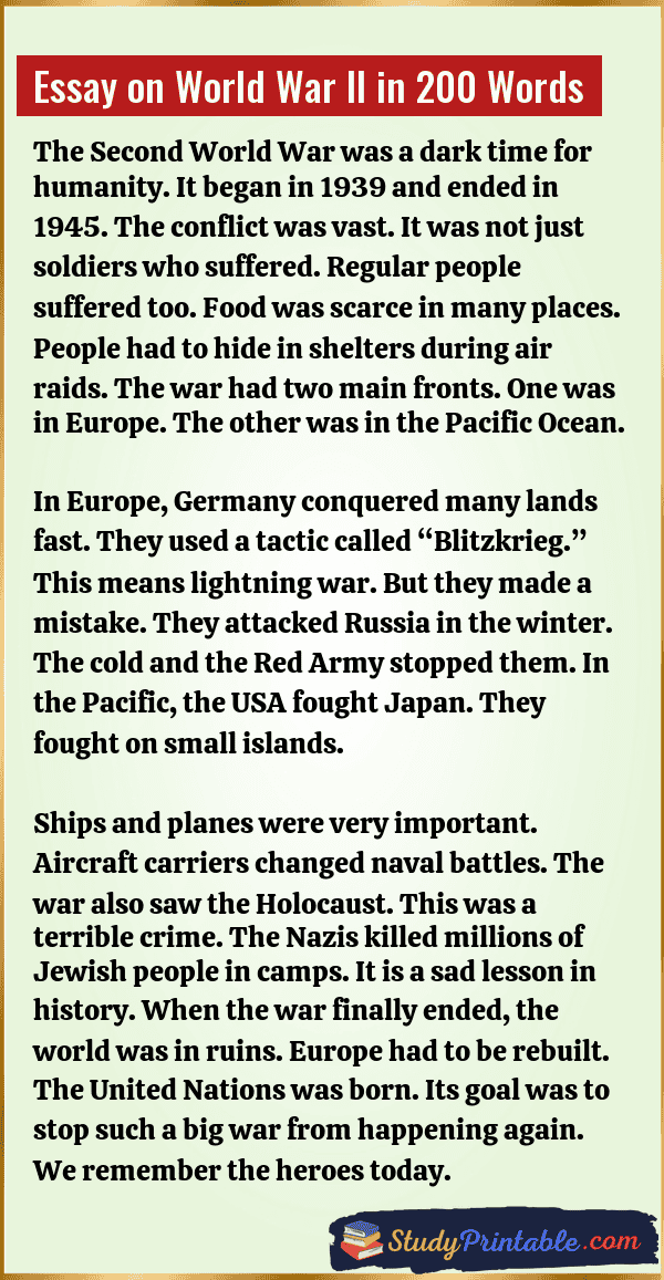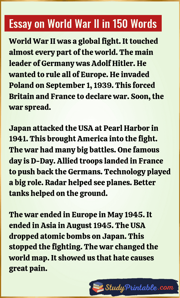 World War II was the biggest war in history. It involved many countries. The world was divided into two groups. One was the Allies. The other was the Axis. Millions of people fought in it. It changed how we live today. New machines were made. Old maps were drawn again. It taught us the value of peace. These essays are written for students in classes 1 to 12.